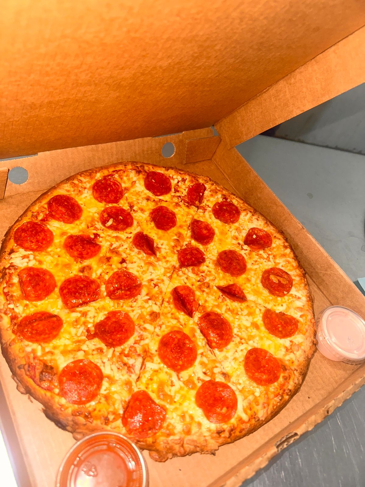 Pizza Grande de Pepperoni, champiñon, pimiento verde y cebolla