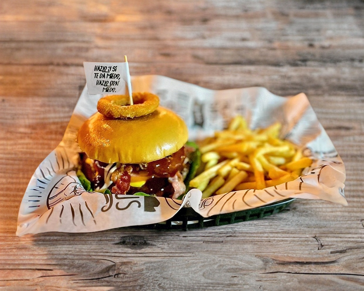 Tocino, aros de cebolla, BBQ, lechuga, tomate y cebolla. 200 gr de papas a la francesa.