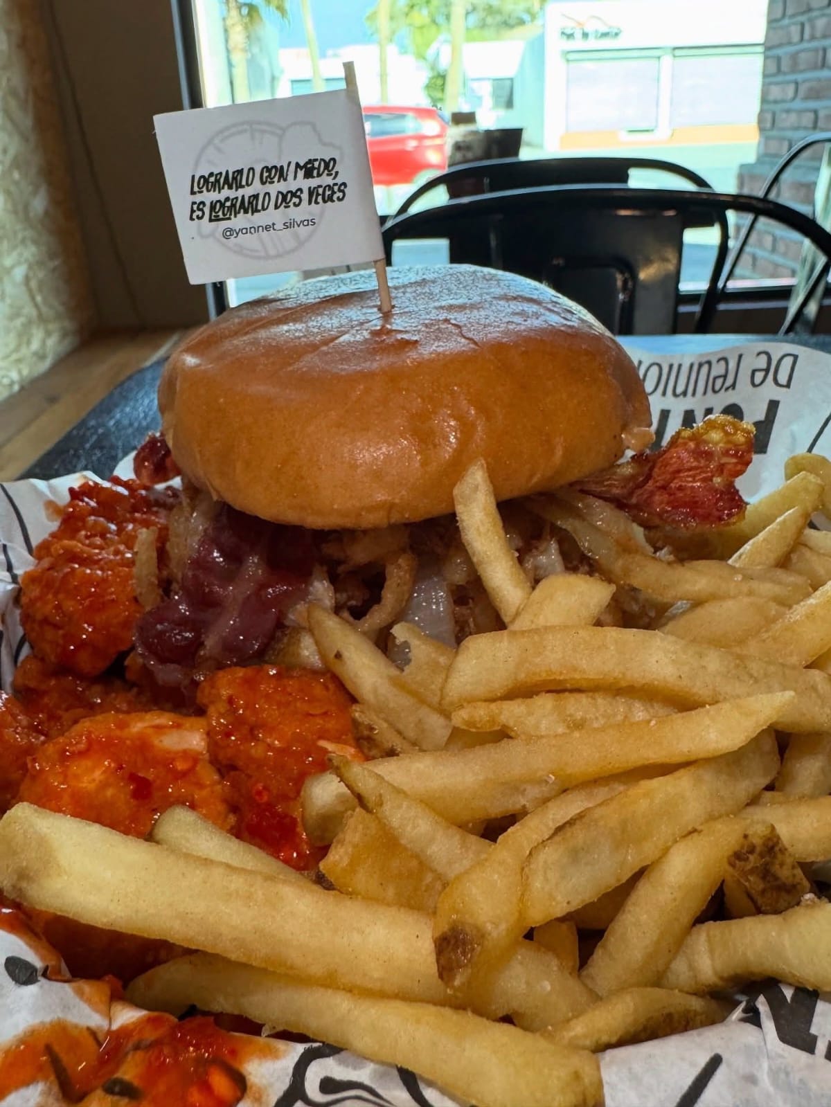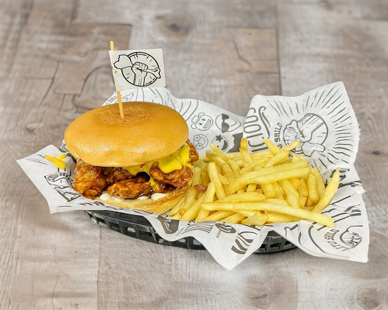 Pan brioshe con aderezo, pollito bañado, queso mozzarela, cebolla crispy, tocino, acompañados de papas a la francesa (200 gr).
