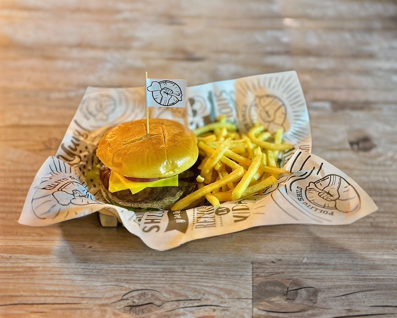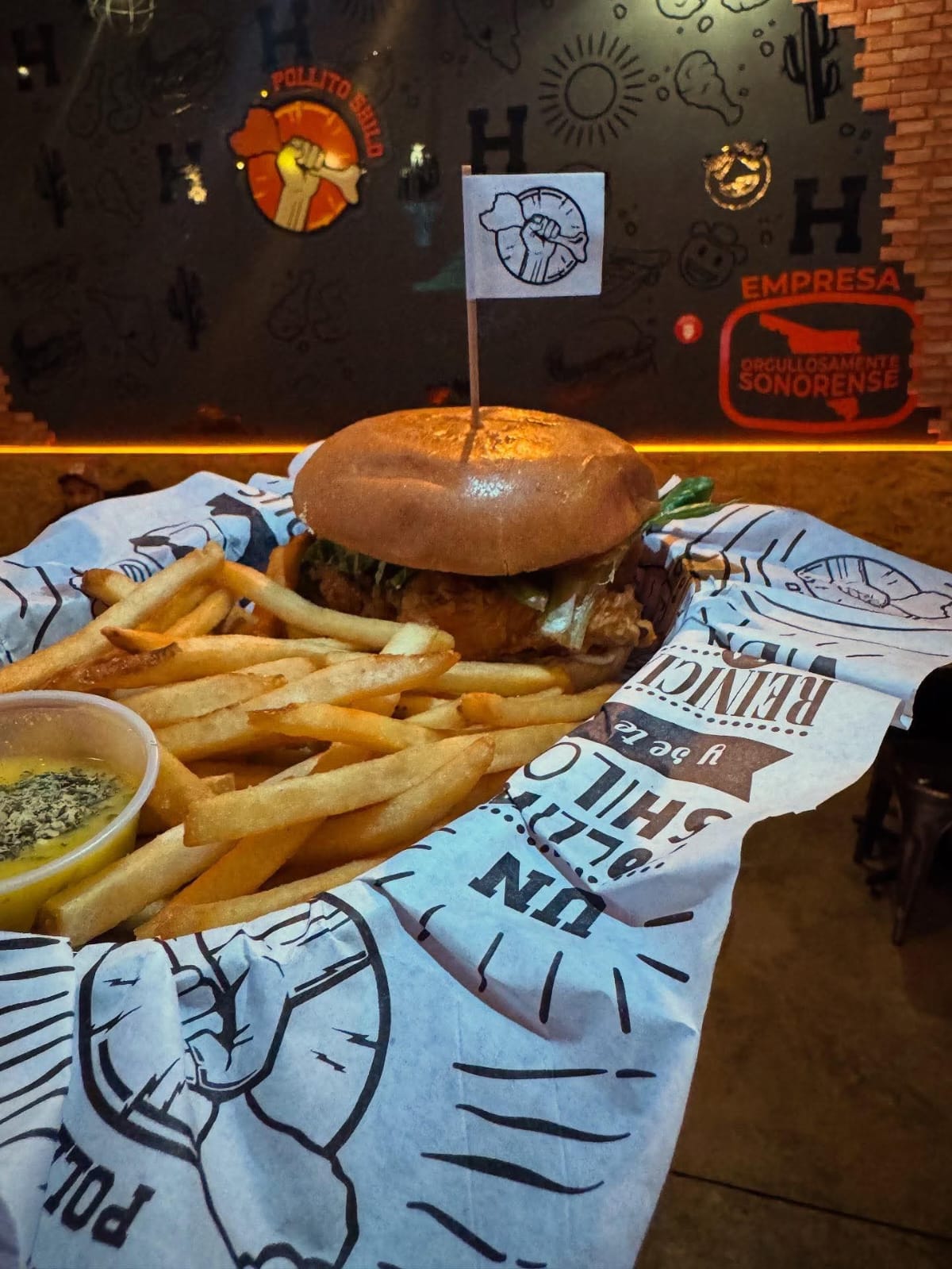 Pan brioshe con aderezo, poliito, 2 bombas de queso y queso americano acompañados de papas a la francesa (200 gr).