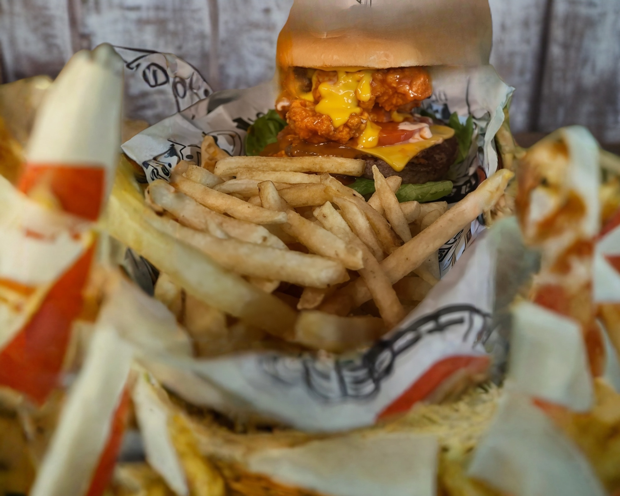 Pan brioshe, boneless (150 gr), bañados en salsa, queso cheddar, recorte de tocino, 150 gr de carne arrachera, queso americano, lechuga, tomate y cebolla, acompañados de papas a la francesa (200 gr).