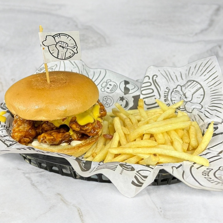 Pan brioche, pollito bañado en salsa, queso cheddar, recorte de tocino, acompañados de papas a la francesa (200 gr).