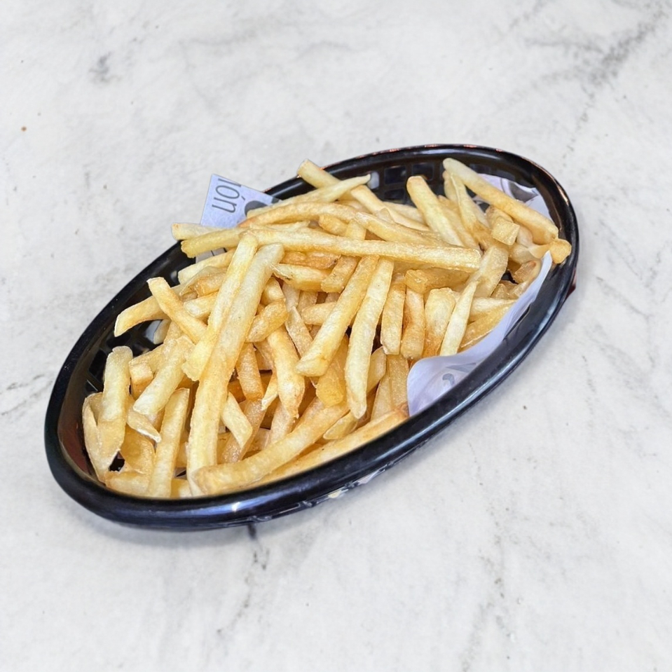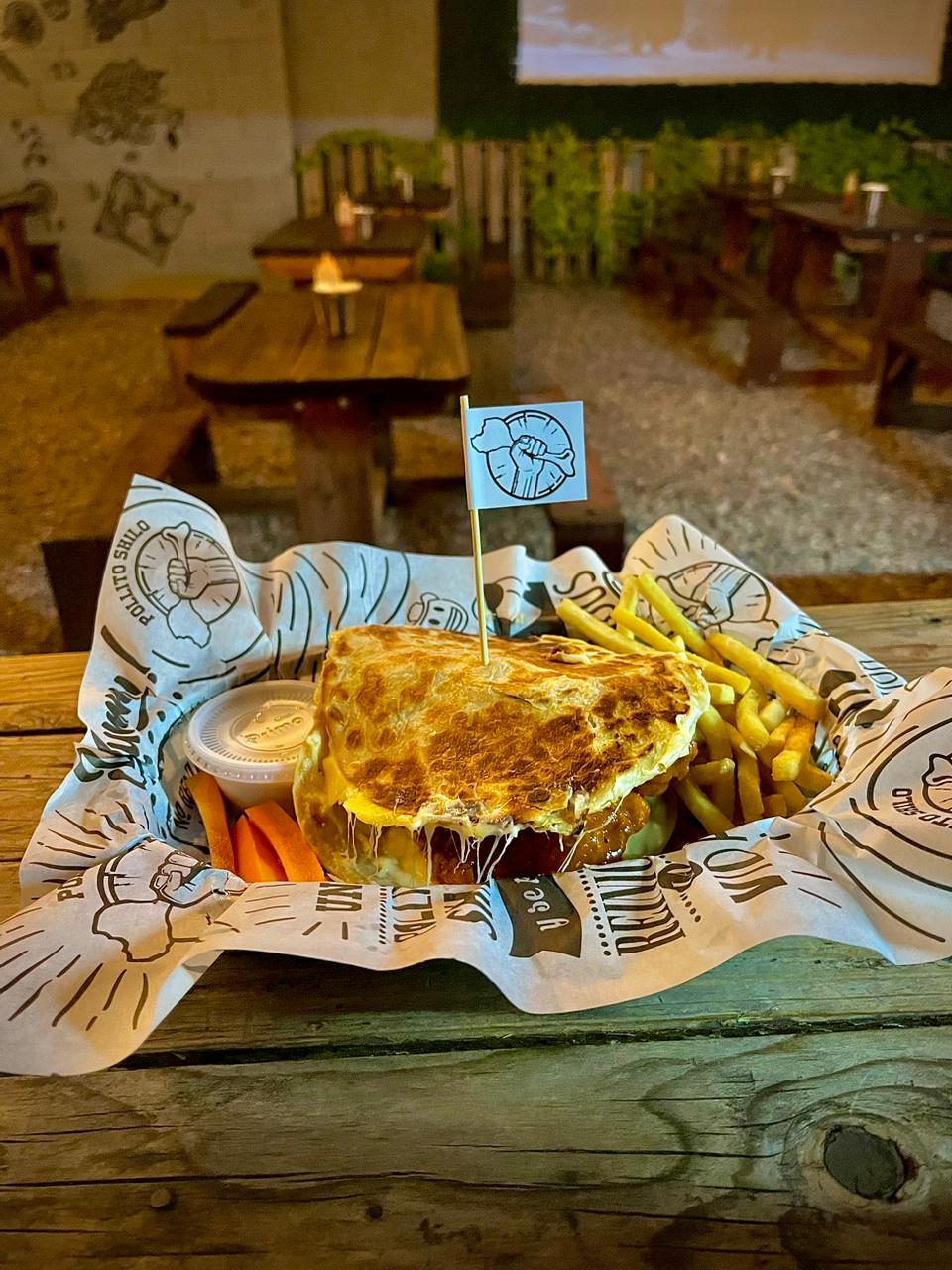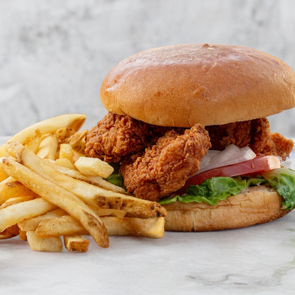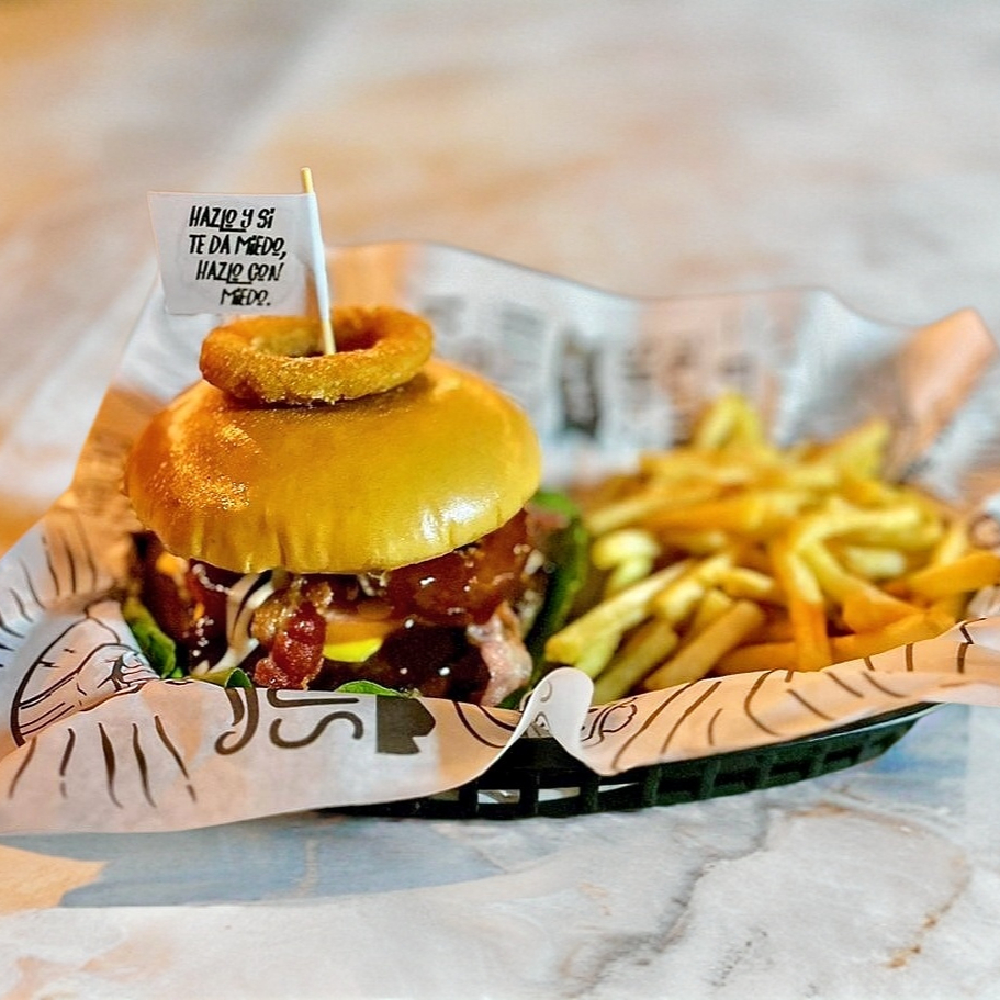 Pan brioche con aderezo, pollito bañado, queso mozzarella, cebolla crispy, tocino, acompañados de papas a la francesa (200 gr).