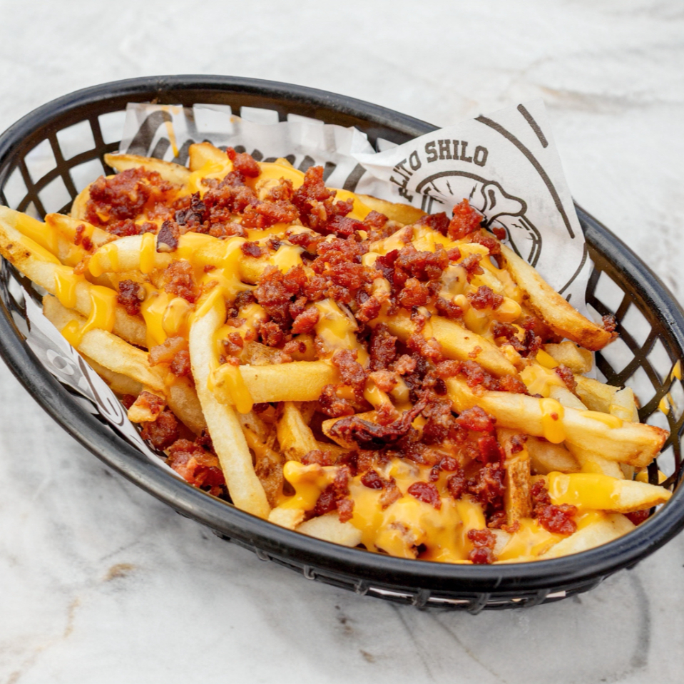 300 gr De papas a la francesa, bañadas con queso cheddar y tocino.