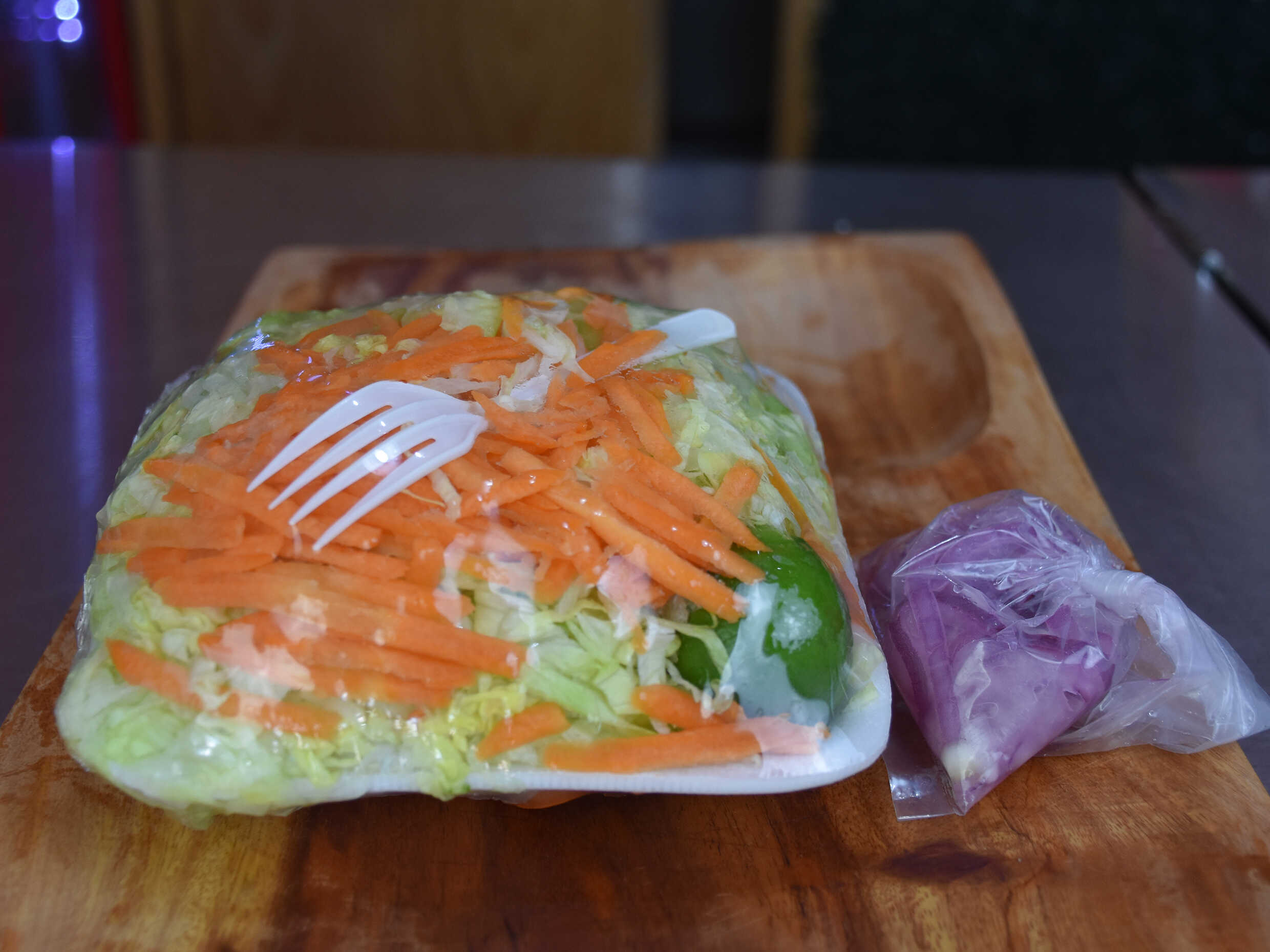 Un plato con lechuga, pepino,zanahoria y una bolsa de cebolla morada curtida.