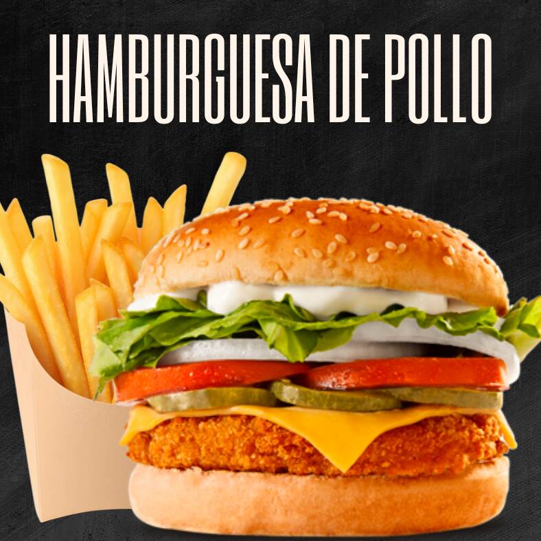 Incluye carne de pollo, queso amarillo, tomate, cebolla, aguacate, lechuga, pepinillos, chile jalapeño, mayonesa, mostaza, catsup y papas a la francesa