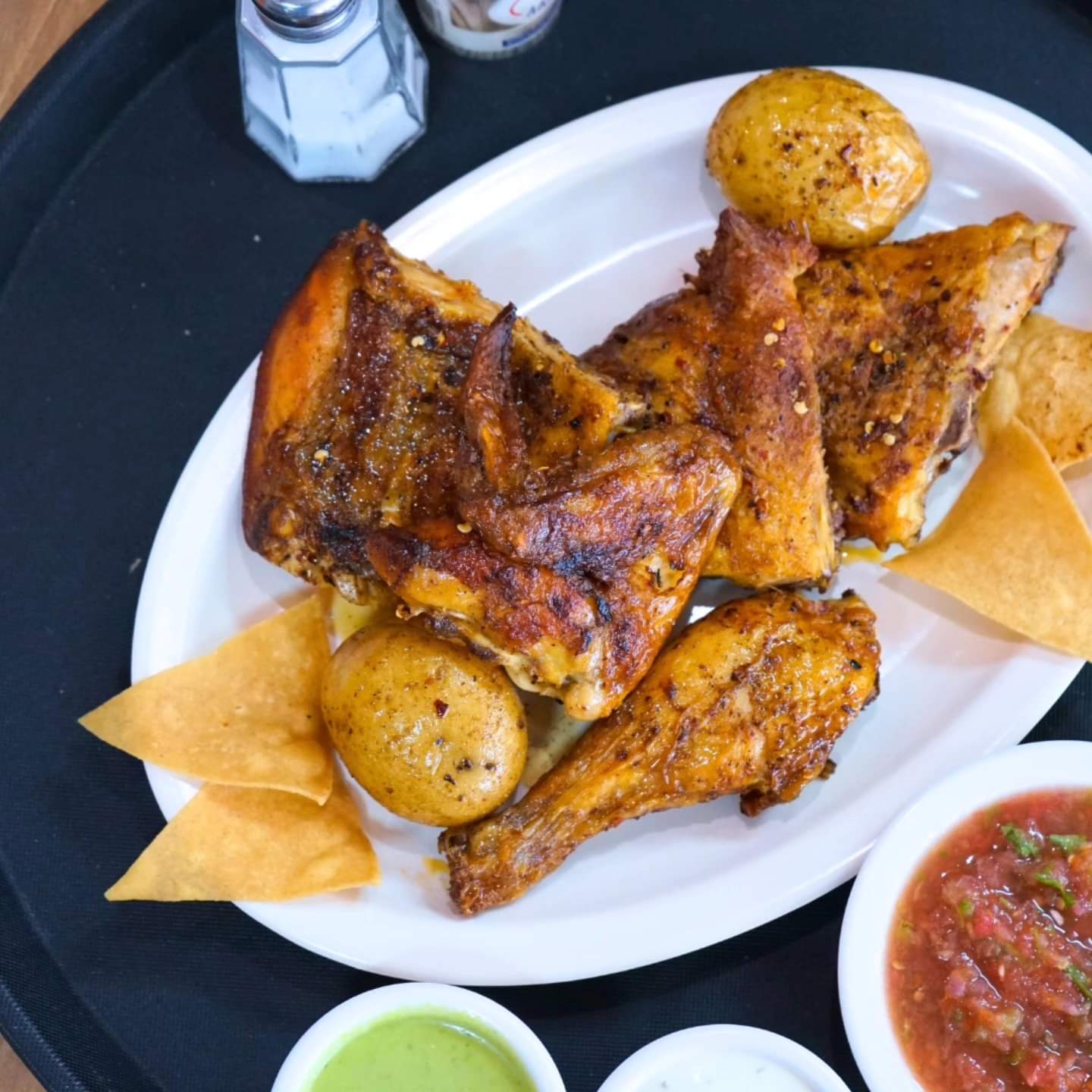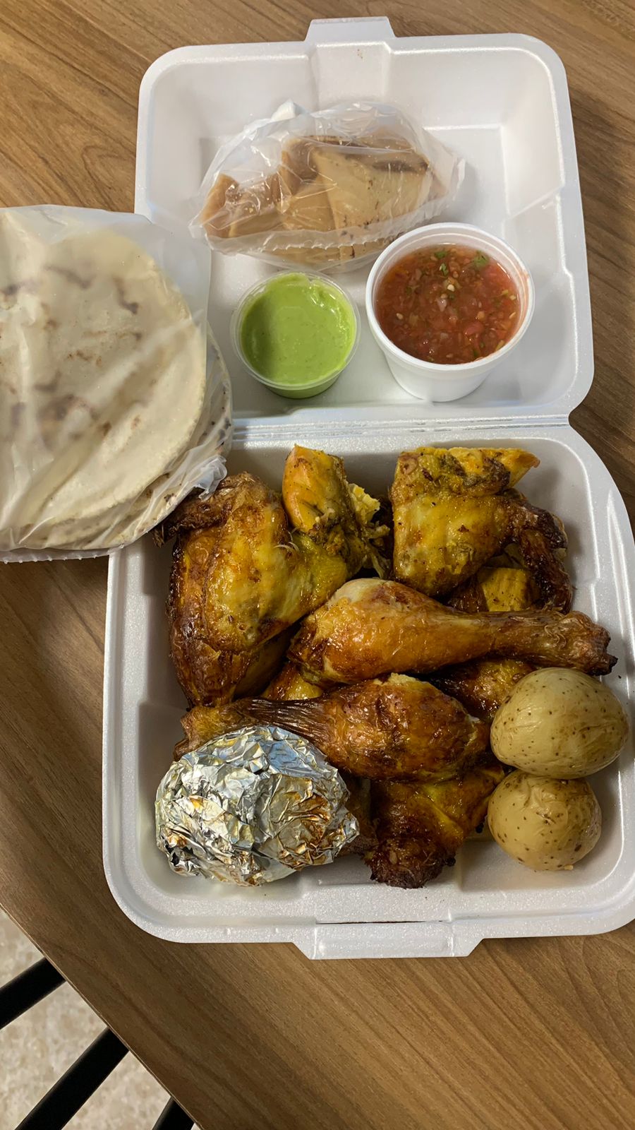 4 pzas de pollo, totopos, tortillas, salsas, cebolla, papa cambray