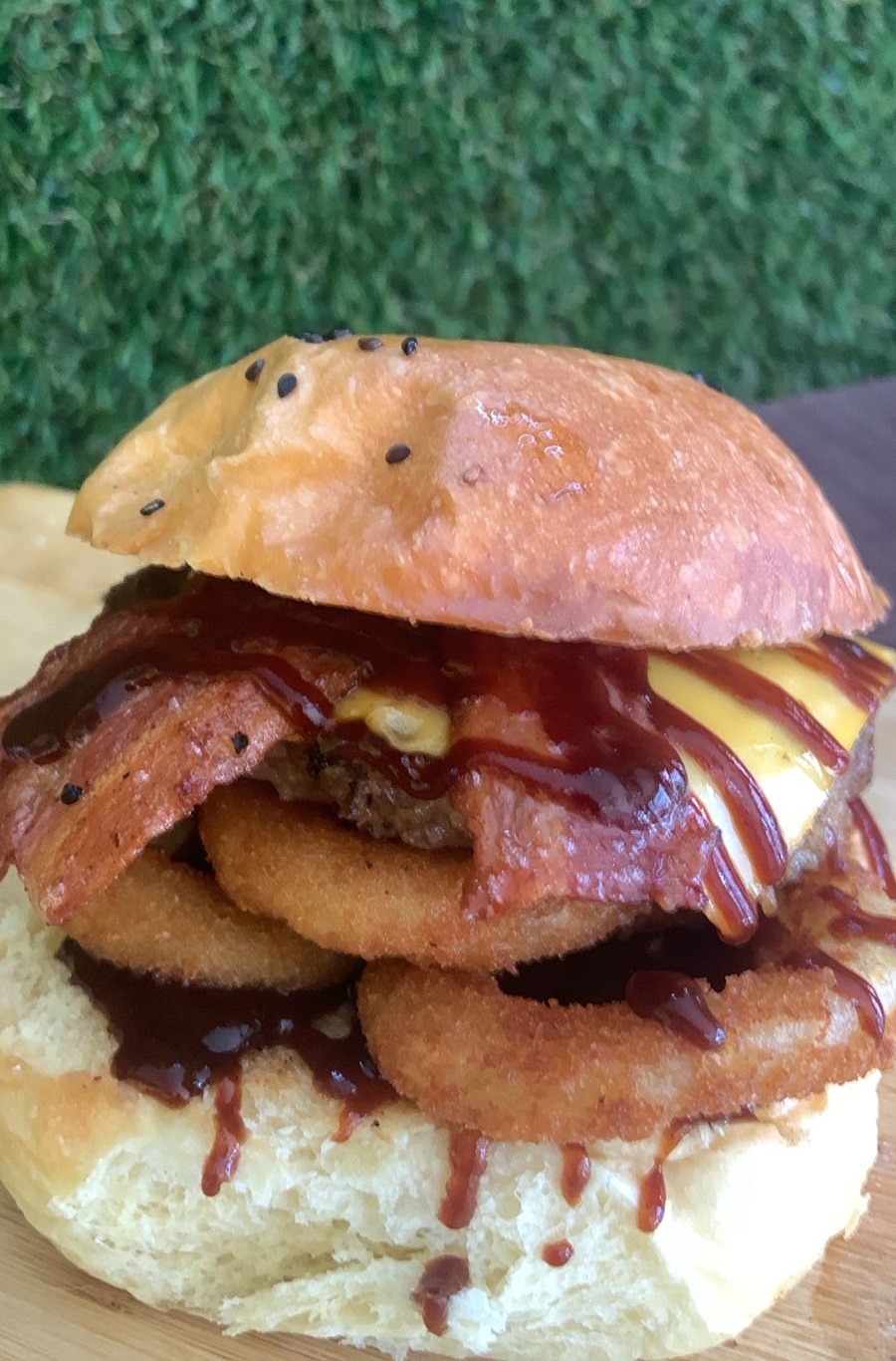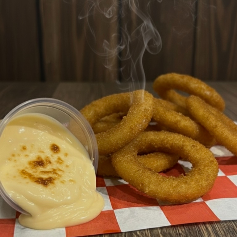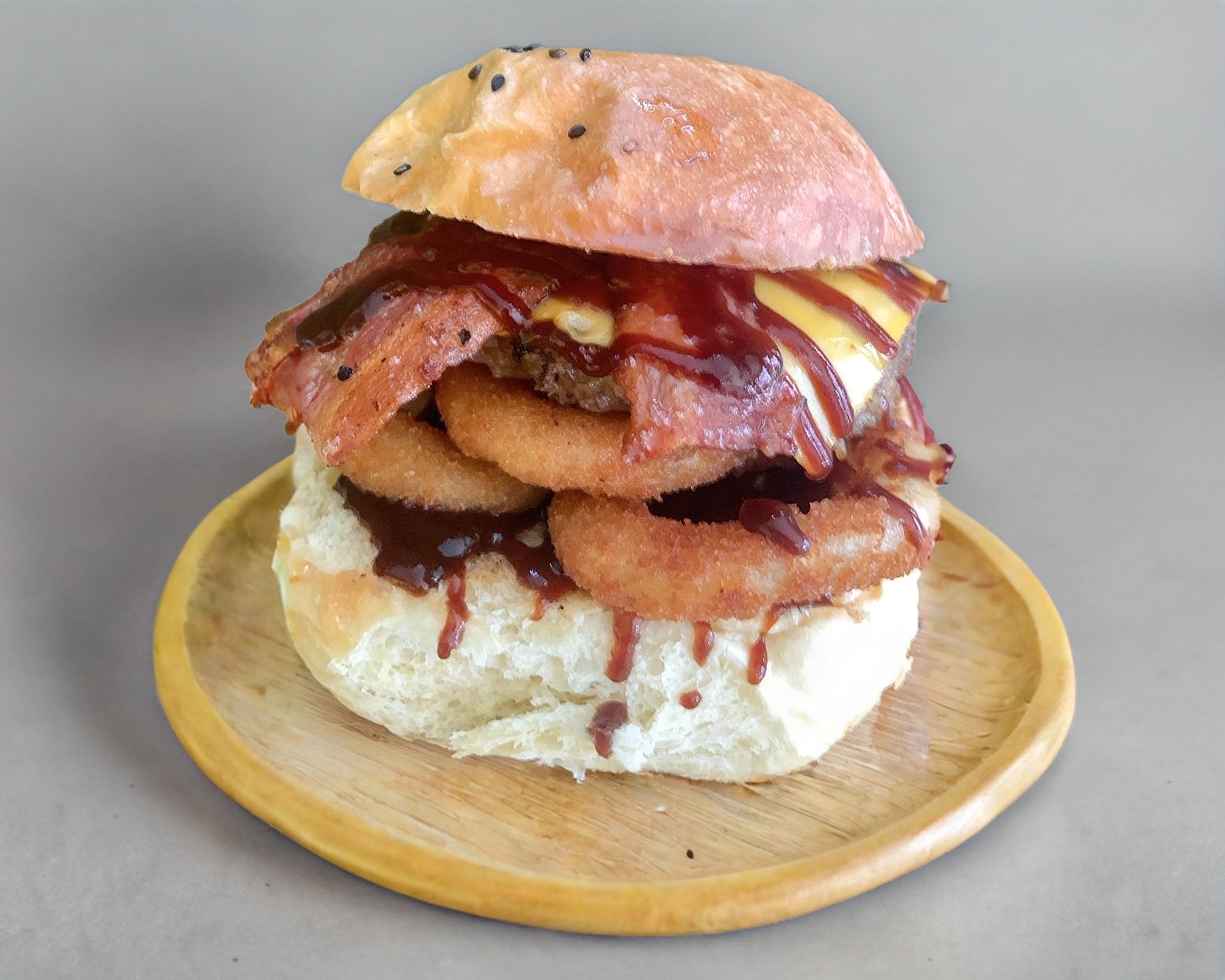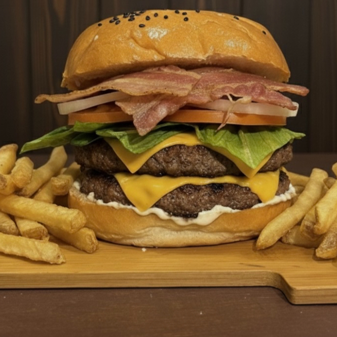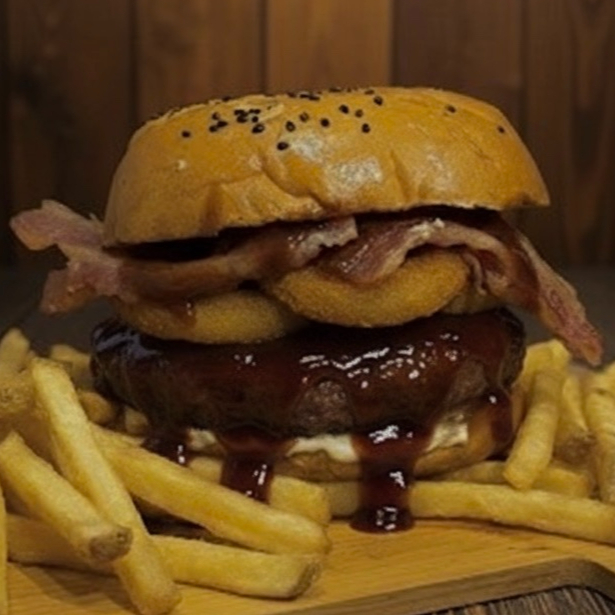 Hamburguesa de res con 2 tiras de tocino, doble queso americano, aros de cebolla empanizado y salsa BBQ