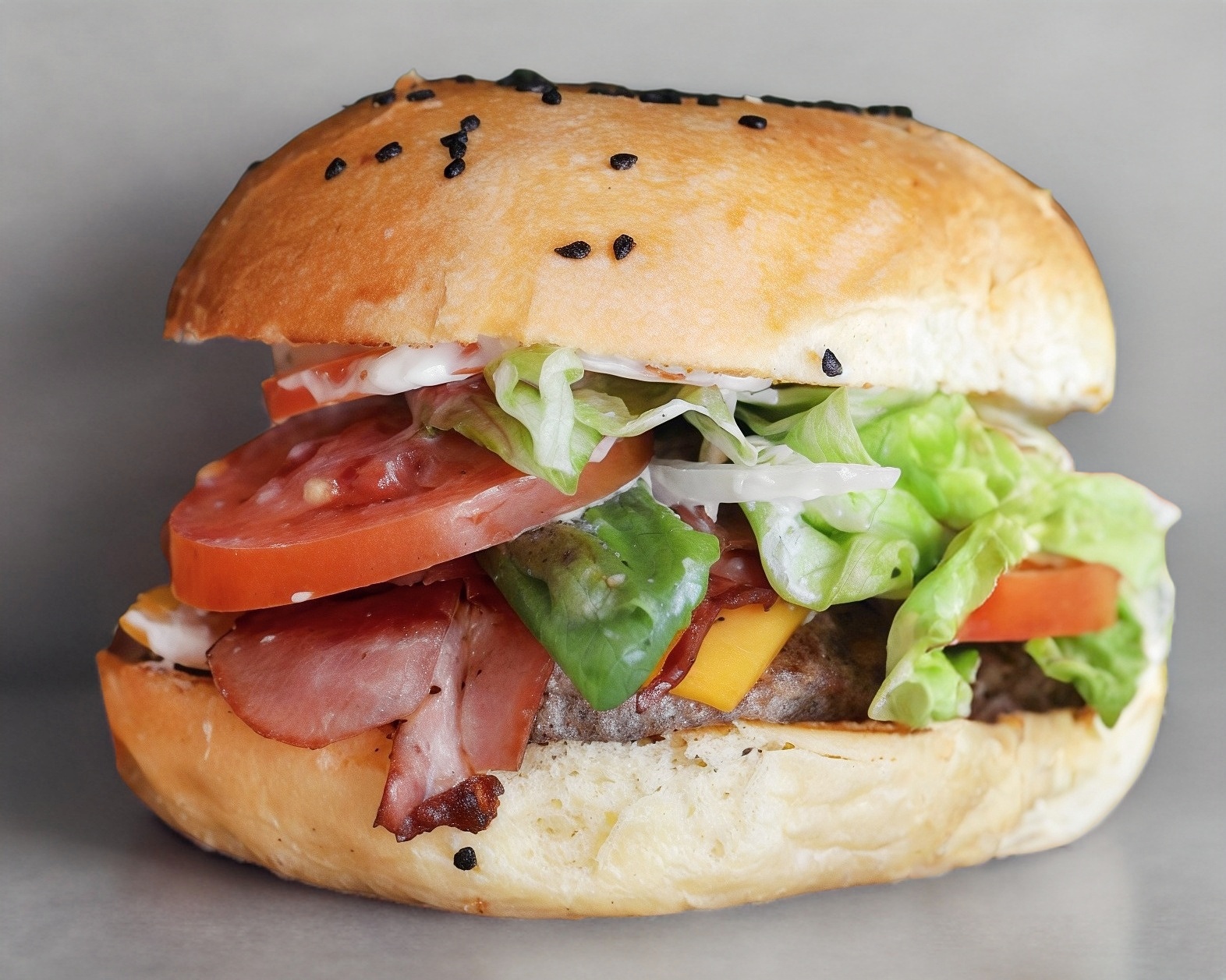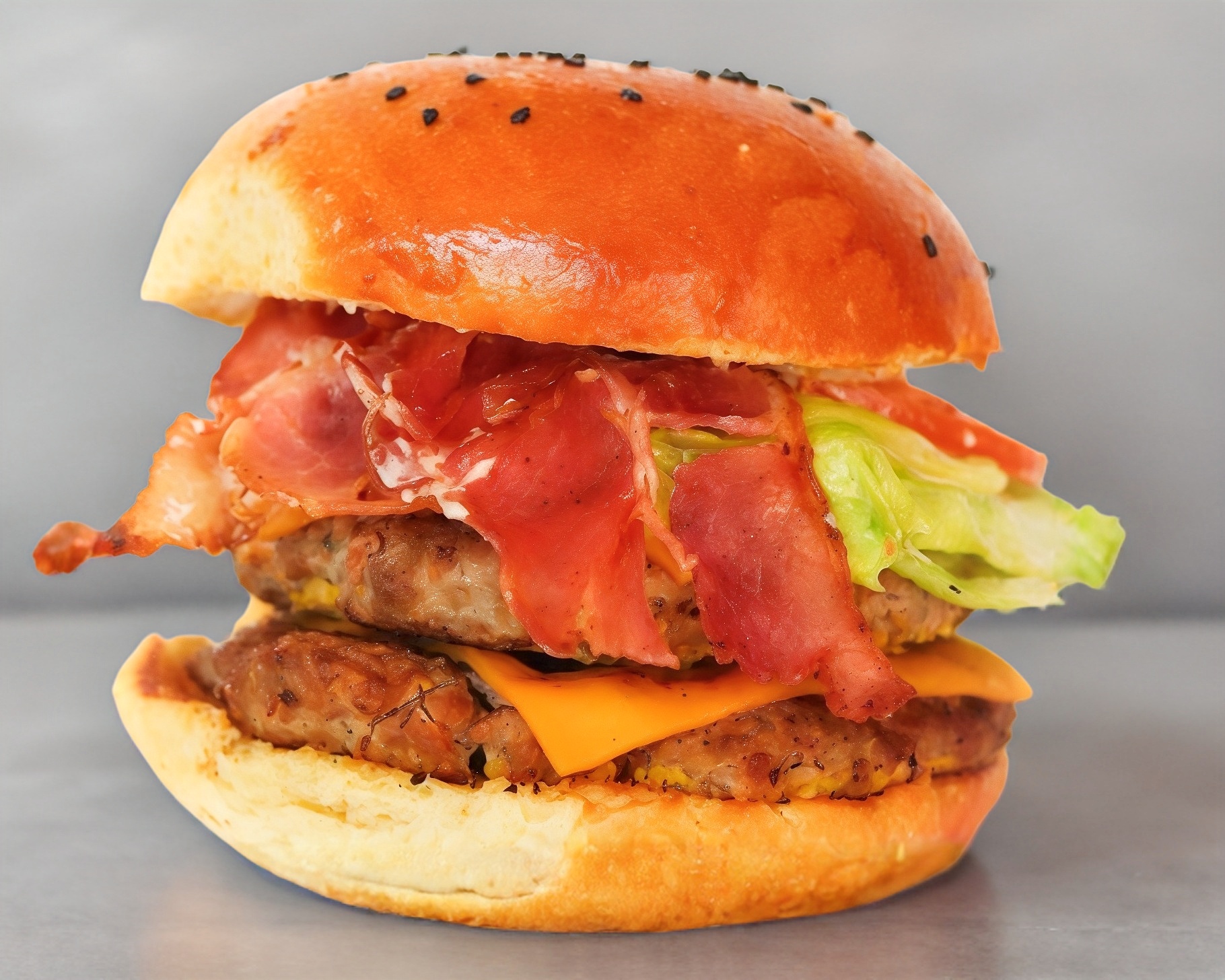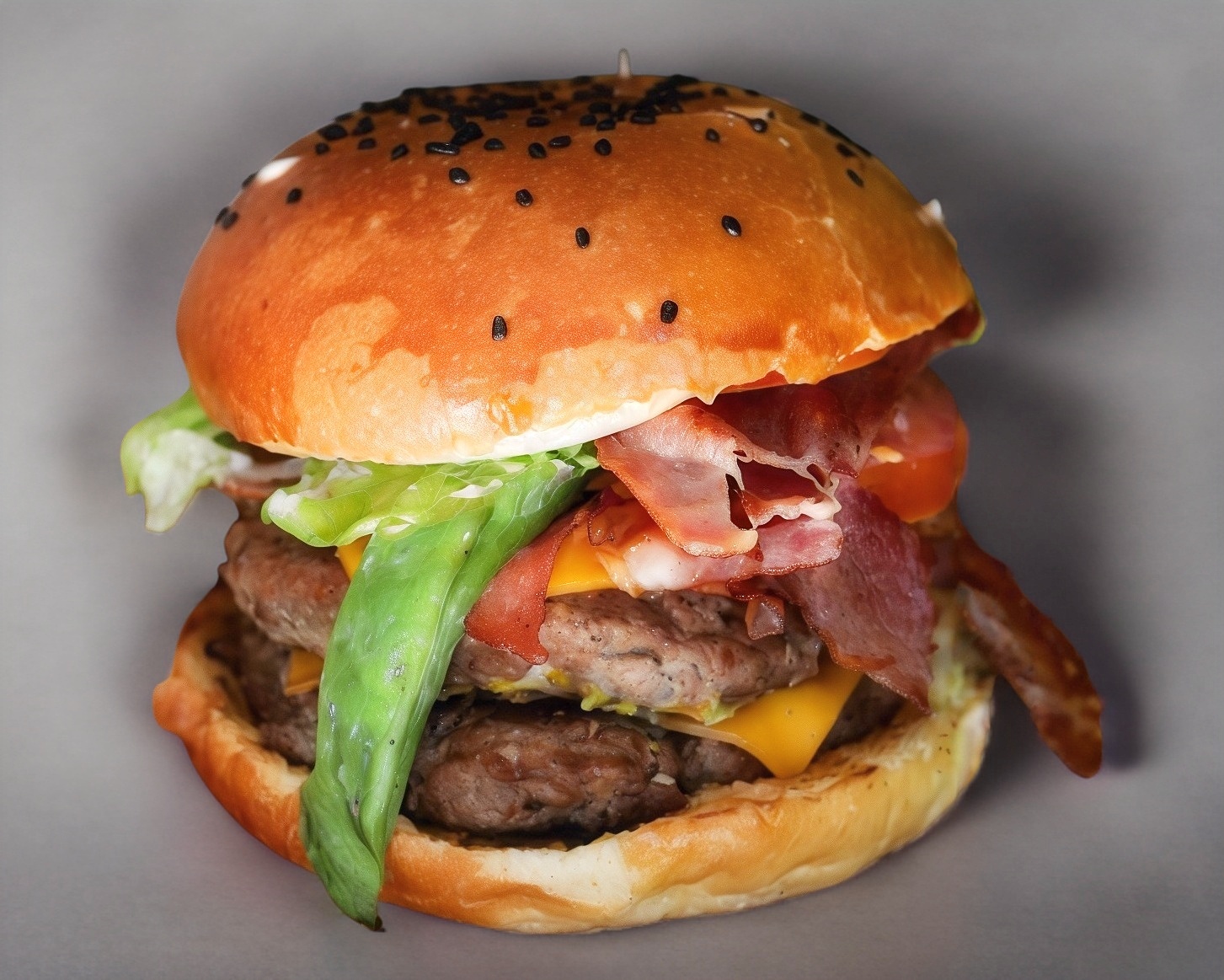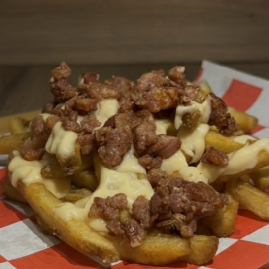 Hamburguesa de res con 2 tiras de tocino, doble queso americano, aros de cebolla empanizado y salsa BBQ