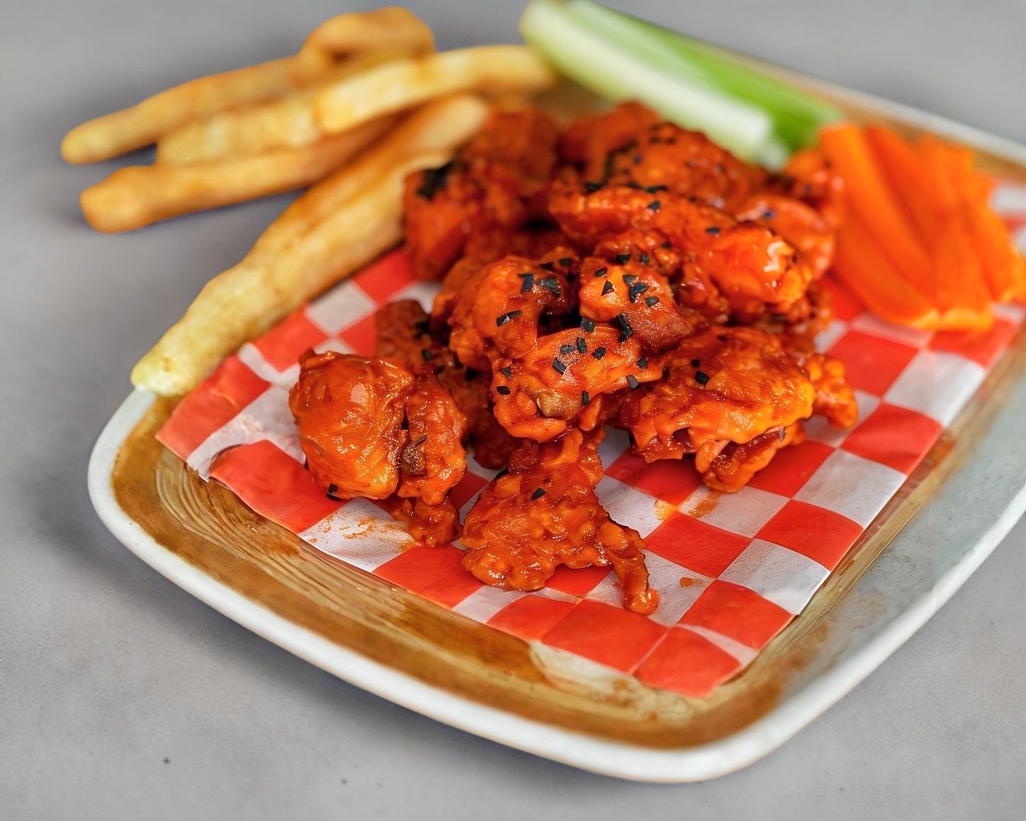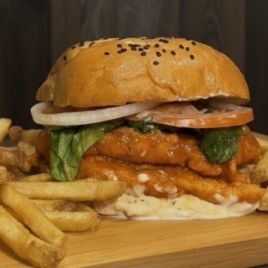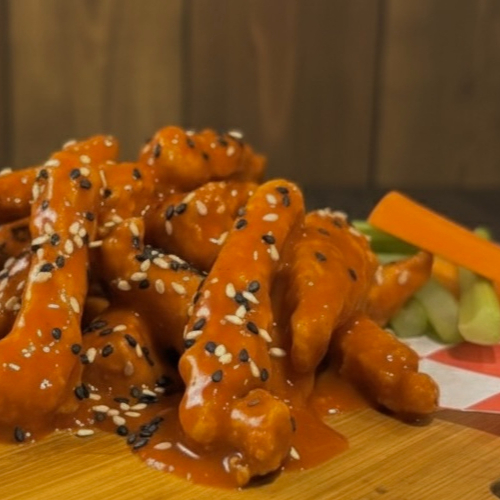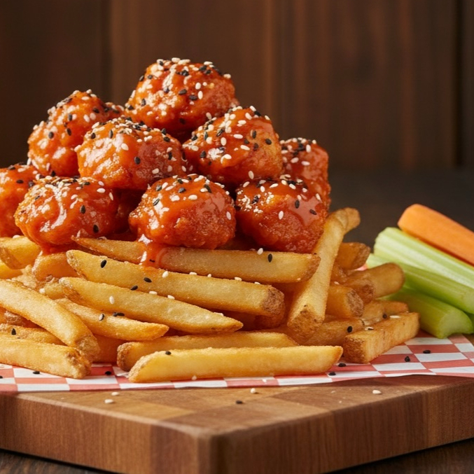 Boneless con salsa de tu elección, lechuga, tomate, cebolla, aderezo ranch y papas