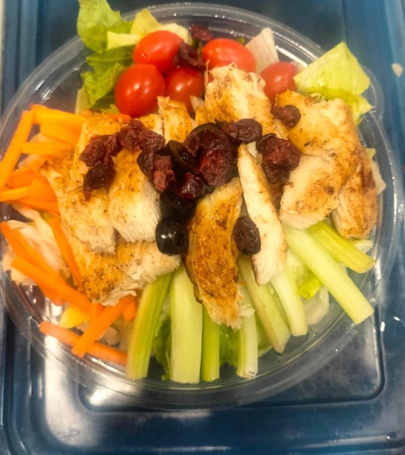 Ensalada de la casa con pollo, incluye jamon, tomate, zanahoria, lechuga, crutones, aceitunas, arandano y vinagre