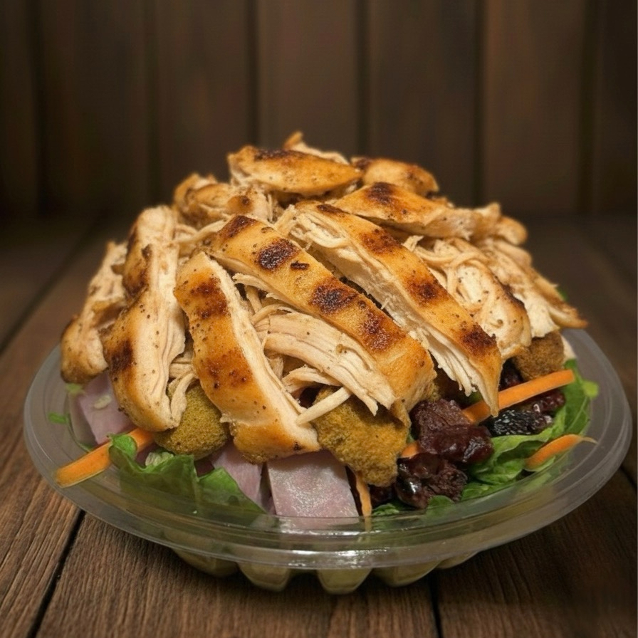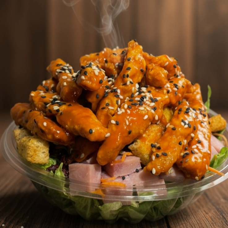 Ensalada de la casa con boneless en tu salsa favorita, incluye jamon, tomate, zanahoria, lechuga, crutones, aceitunas, arandano y vinagre