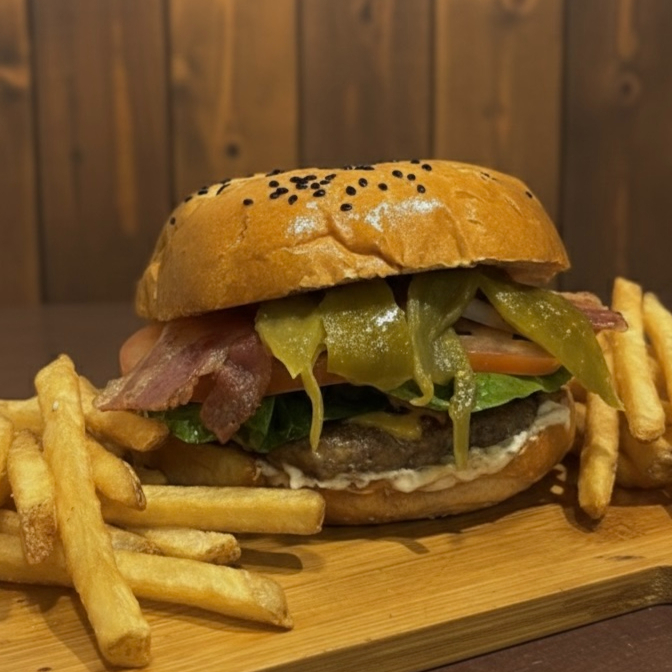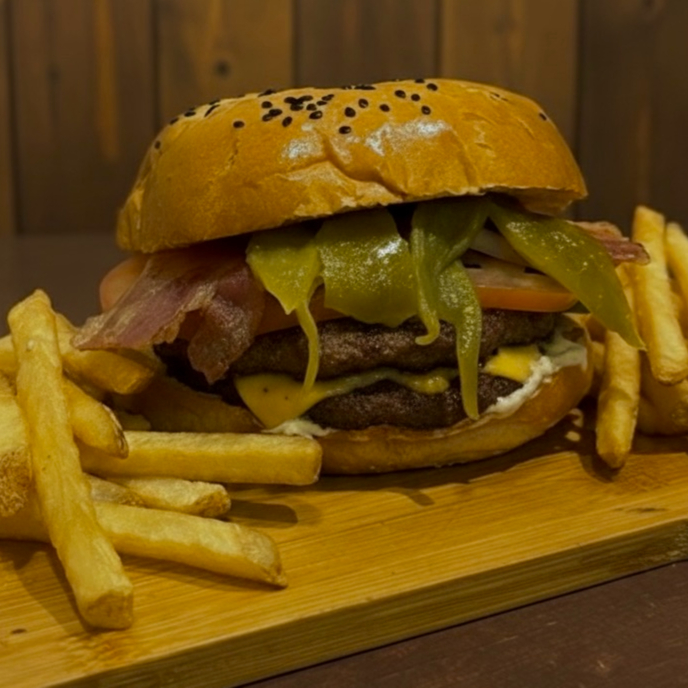 Hamburguesa de carne de res, queso amarillo, lechuga, tomate, cebolla, mayonesa, tocino, chile verde, mostaza con papas fritas.