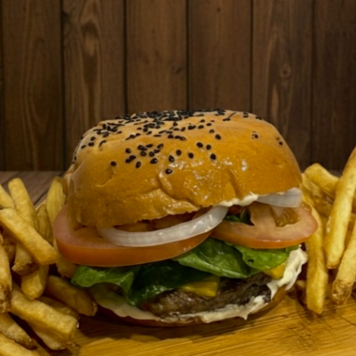 Hamburguesa de carne de res, queso amarillo, lechuga, tomate, cebolla, mayonesa, mostaza con papas fritas.