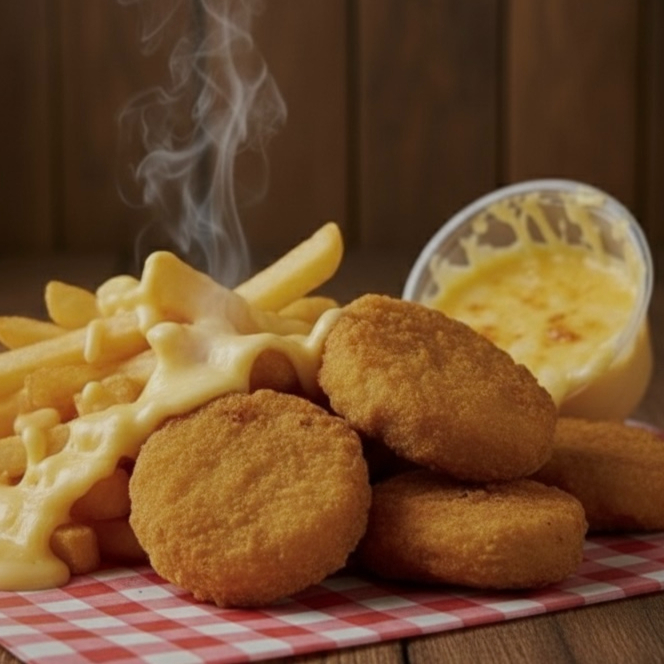 Pollo (200 gr apróx.), salsa de tu elección y papas. (Personal)