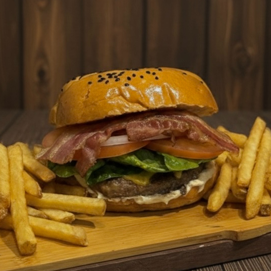 Hamburguesa de carne de res, queso amarillo, lechuga, tomate, cebolla, tocino, mayonesa, mostaza con papas fritas.