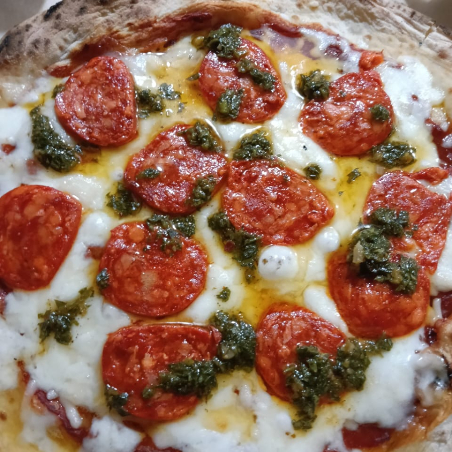 Masa fermentada con 24 hrs en frio, salsa de tomate de la casa, mezcla de quesos, chorizo español, y un toque de chimichurri de la casa (diámetro aprox, 22 a 24 cm)