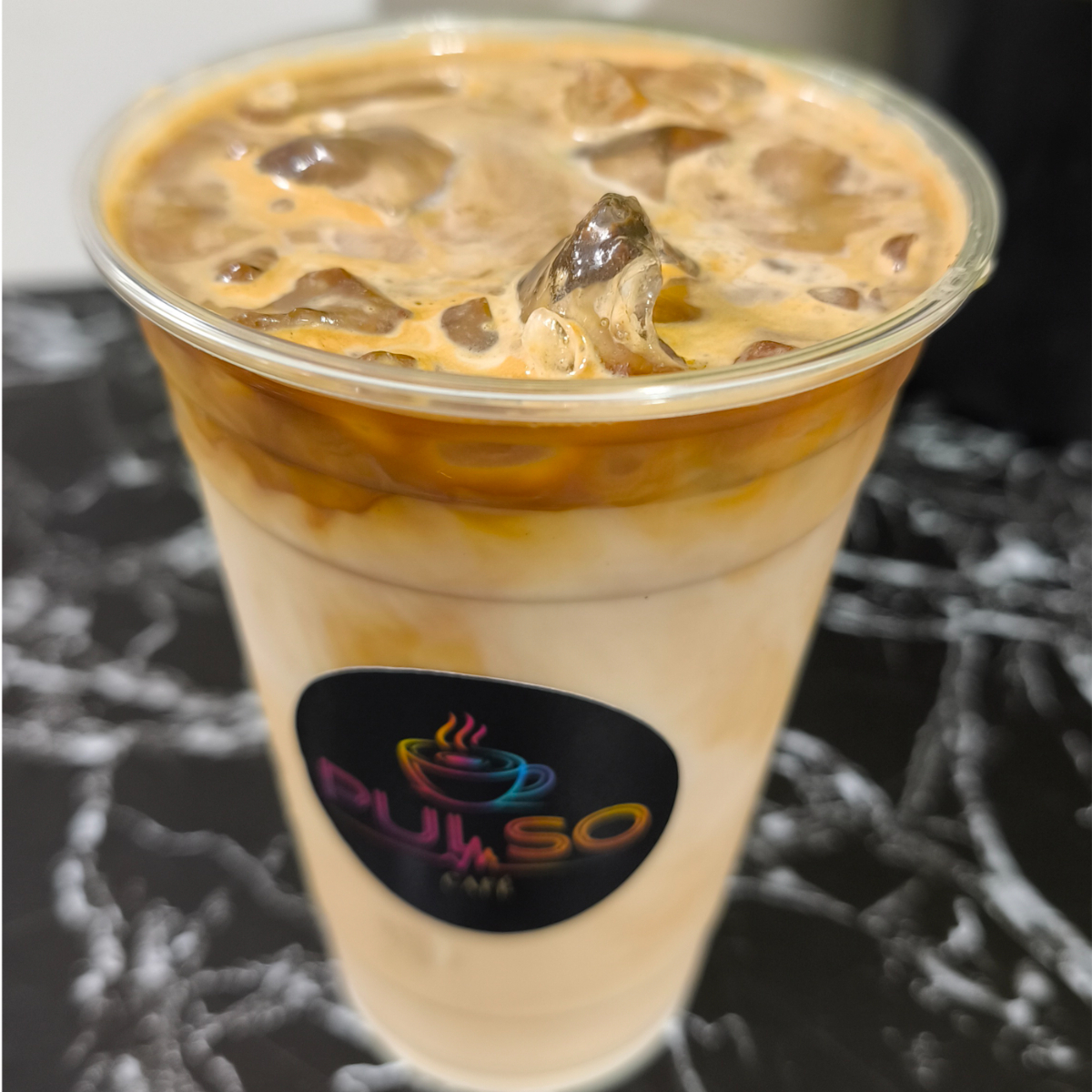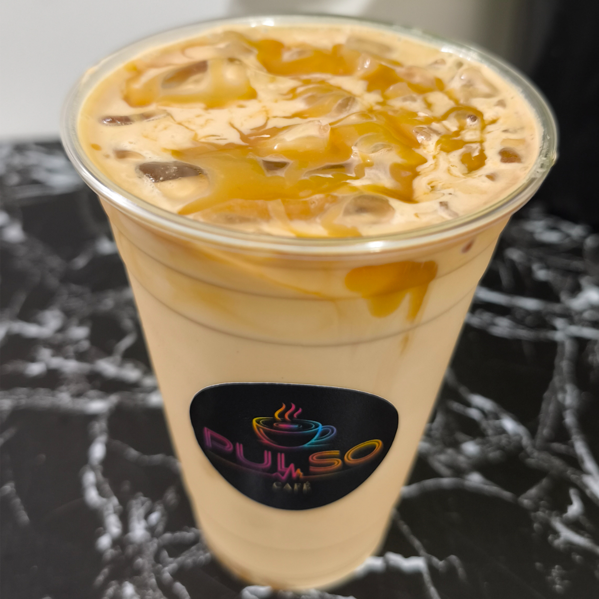 Espresso doble mezclado con salsa de caramelo, leche fría y hielo