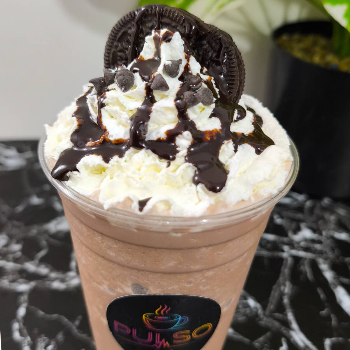 Es una mezcla granizada de doble espresso, leche, hielo, galleta oreo y salsa de chocolate coronado con crema batida