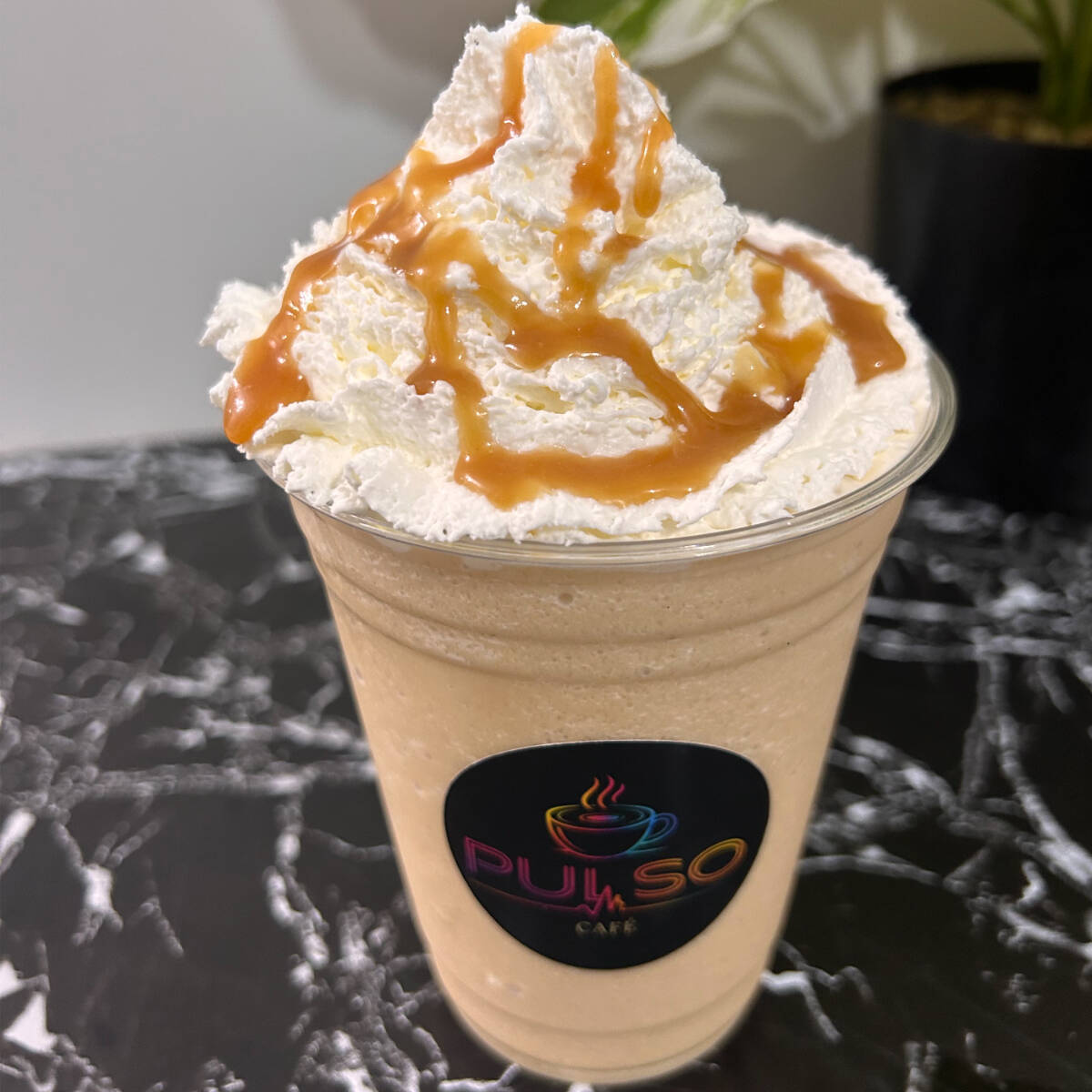 Es una mezcla granizada de doble espresso, leche, hielo y salsa de caramelo coronado con crema batida