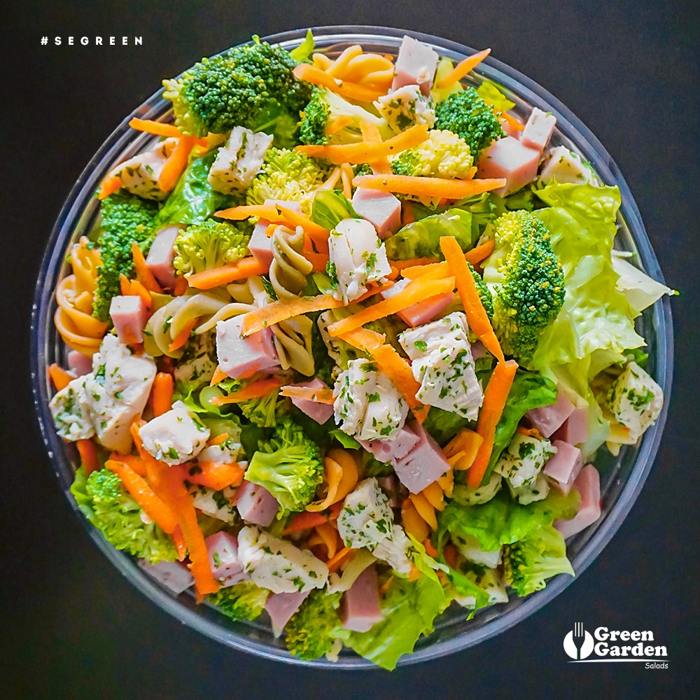 Cama de lechuga, pechuga de pollo bañada en salsa teriyaki. Pasta, elote, pepino, queso parmesano y/o , croton o fritura, 2 aderezos a elegir.