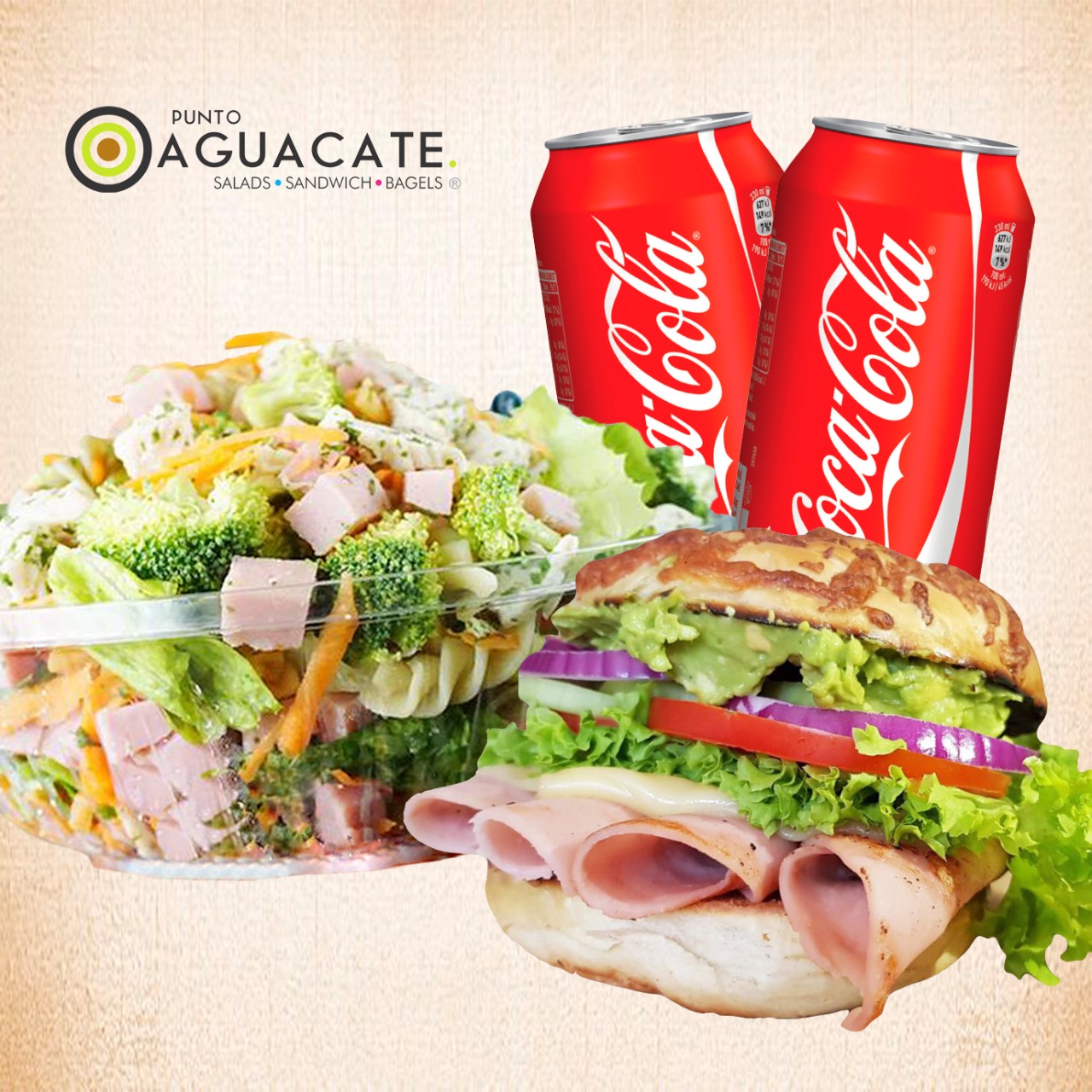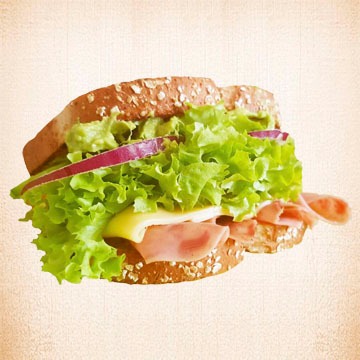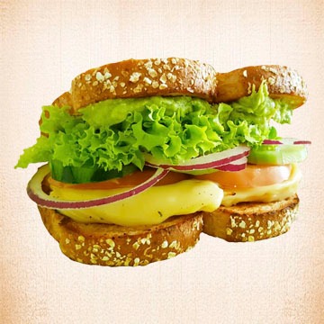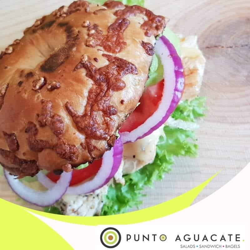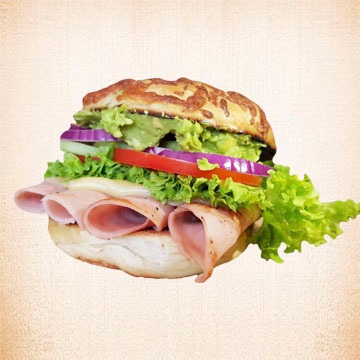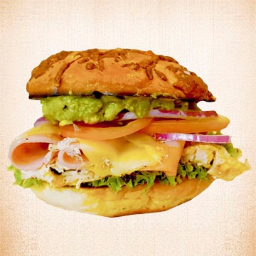 Con jamón de pavo, queso manchego, lechuga, tomate, pepino, cebolla morada y aguacate.