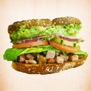 Con jamón de pavo, lechuga, tomate, pepino, cebolla morada y aguacate.