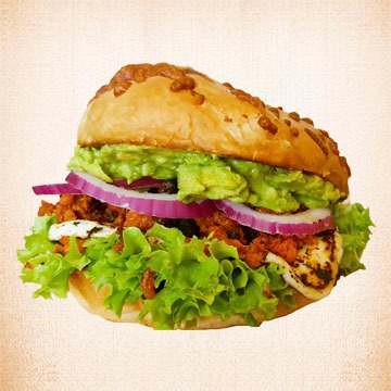 Con queso panela a la plancha, queso manchego, lechuga, tomate, pepino, cebolla morada y aguacate.