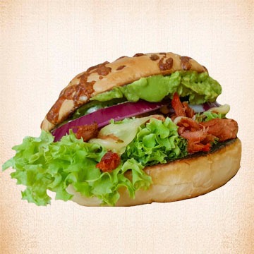 Con tocino, lechuga, tomate, pepino, cebolla morada, queso manchego y guacamole. Picante.