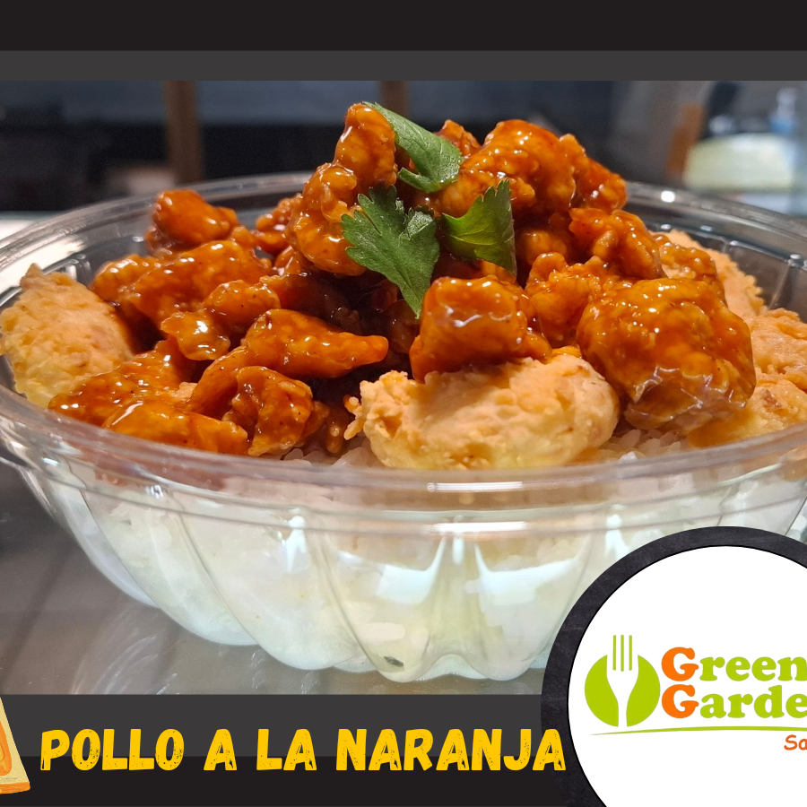 Joel servido con trozos de pollo bañados en salsa oriental de naranja con arroz, cebollín, soya, y chipotle