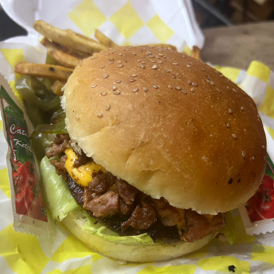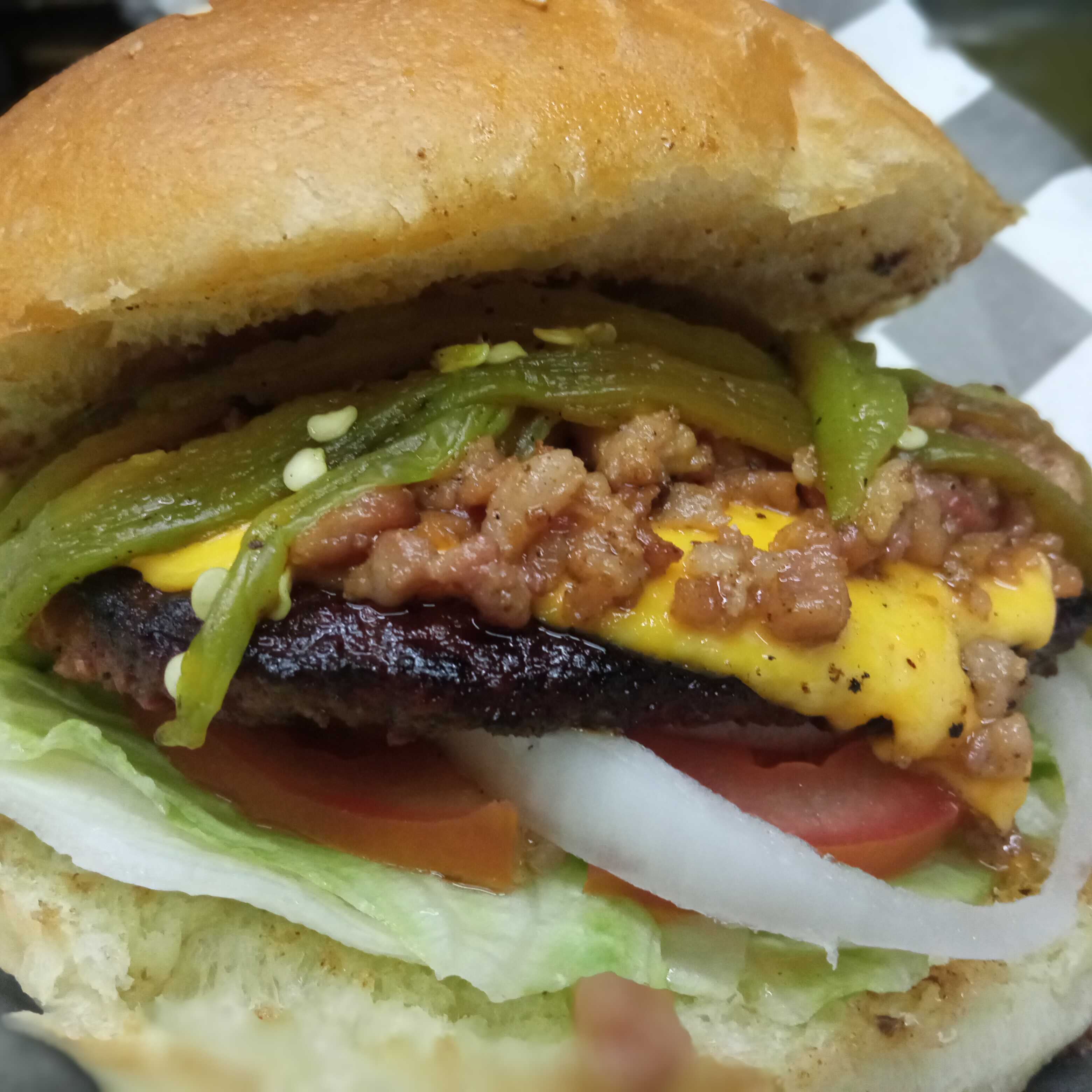Hamburguesa de carne 100% de res con queso, cebolla, tomate, lechuga, tocino, chile verde acompañada de papas fritas