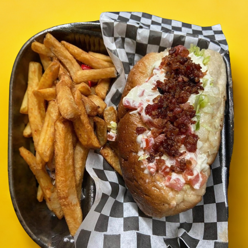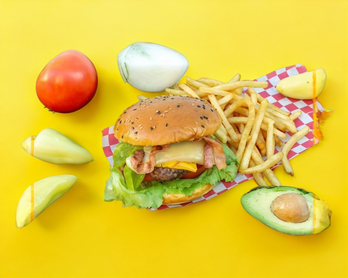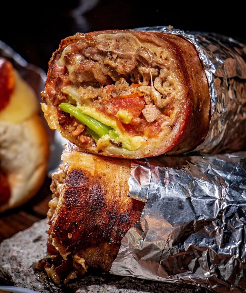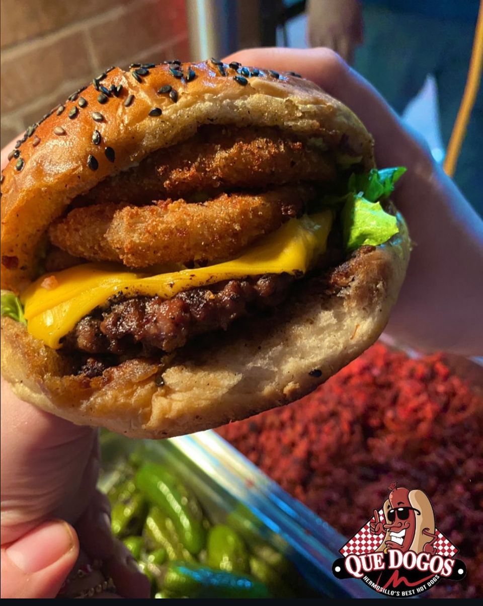 Carne, queso, queso Philadelphia, tocino, aguacate, tomate, mayonesa.