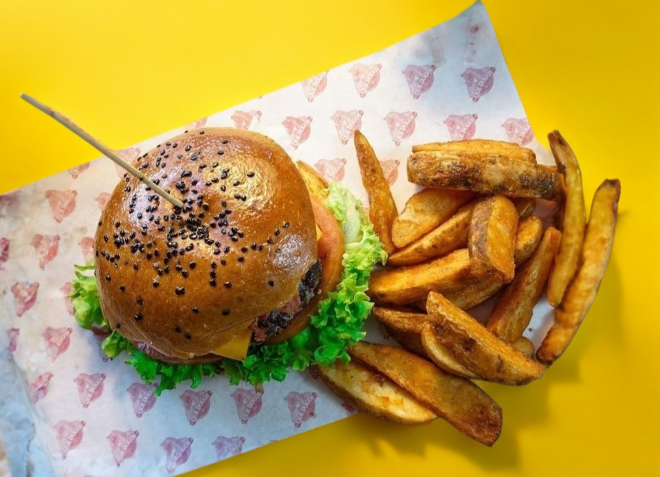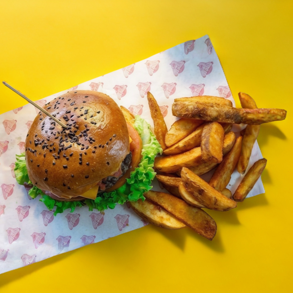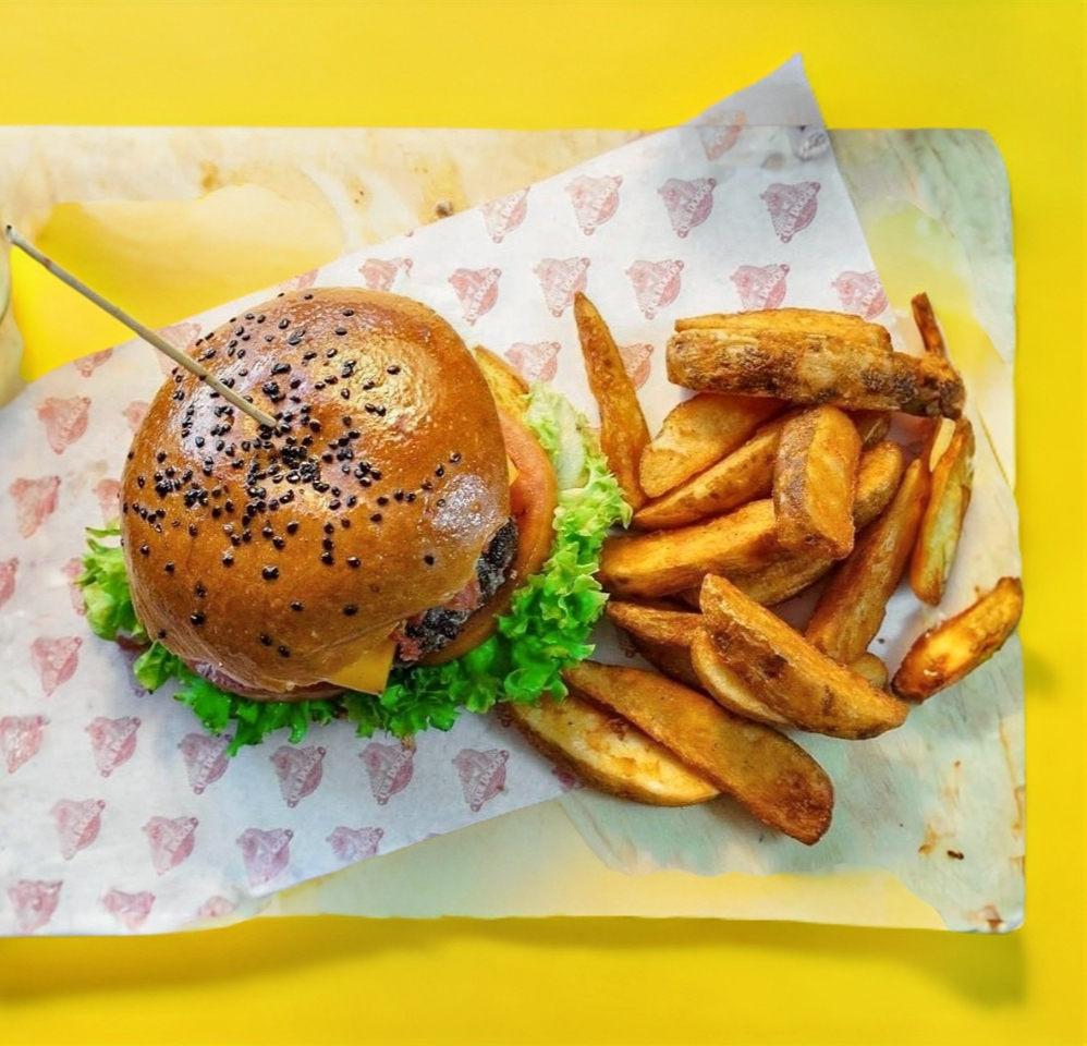 Carne angus de res, queso cheddar y papas a la francesa.