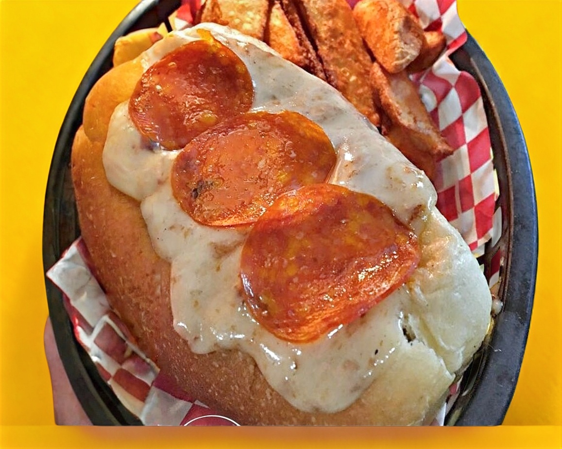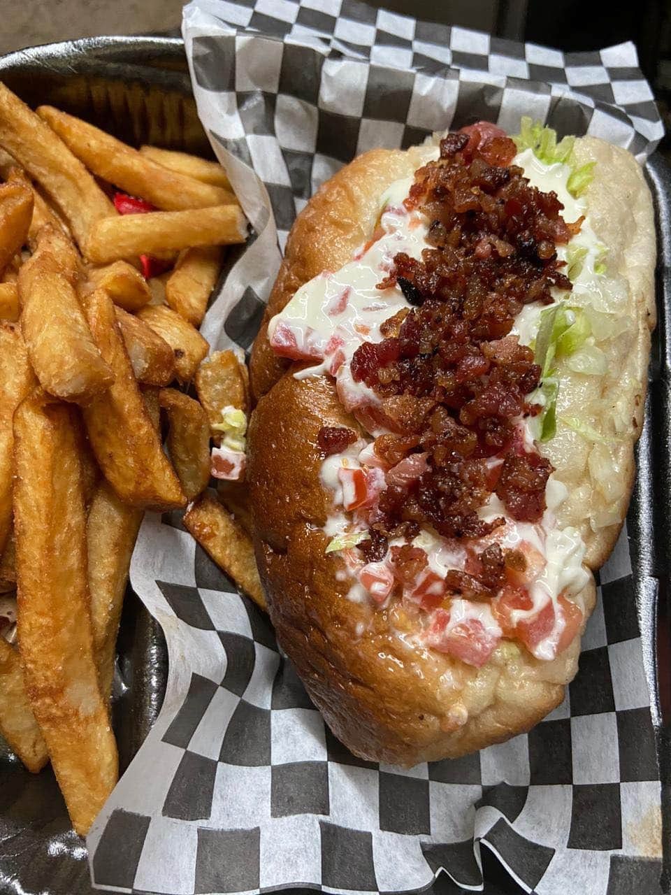 Carne de res con champiñones, tocino, queso blanco y papas a la francesa.