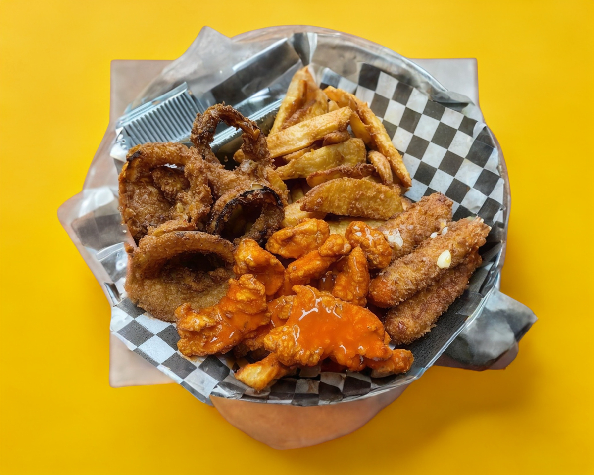 Boneless, 4 dedos de queso, papas a la francesa y aros de cebolla.
