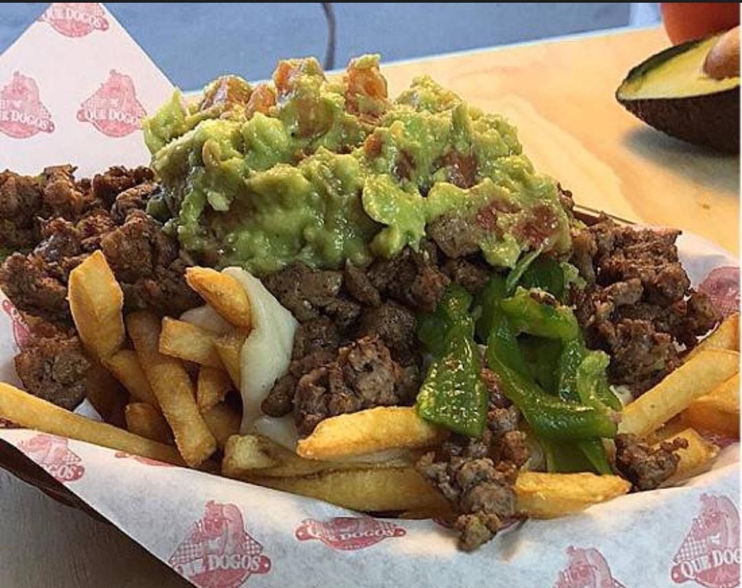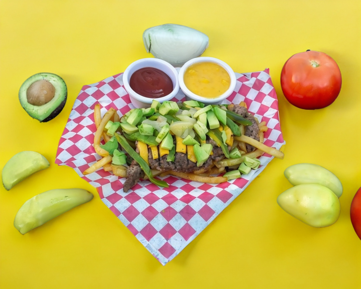 Papas a la francesa con carne de res, salchicha, chile verde y guacamole.