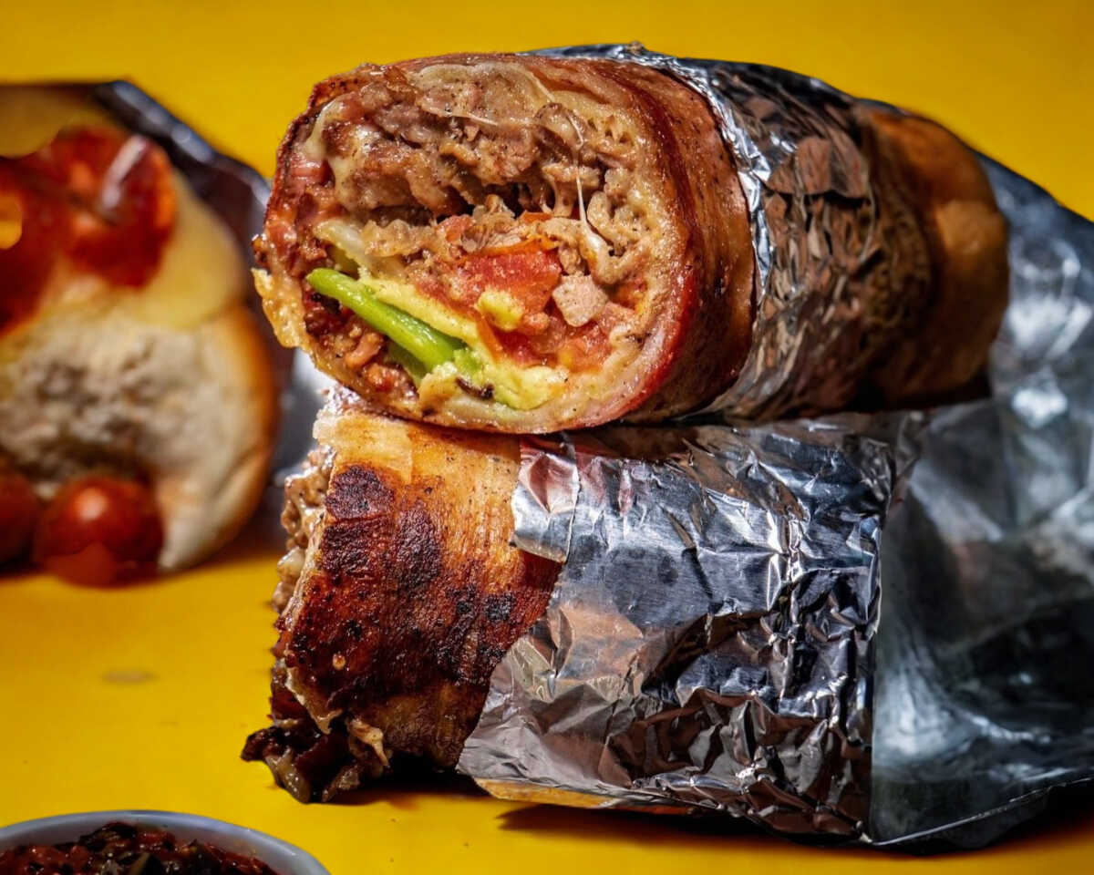 Carne, queso, tocino, pepperoni, aguacate, tomate, mayonesa.
