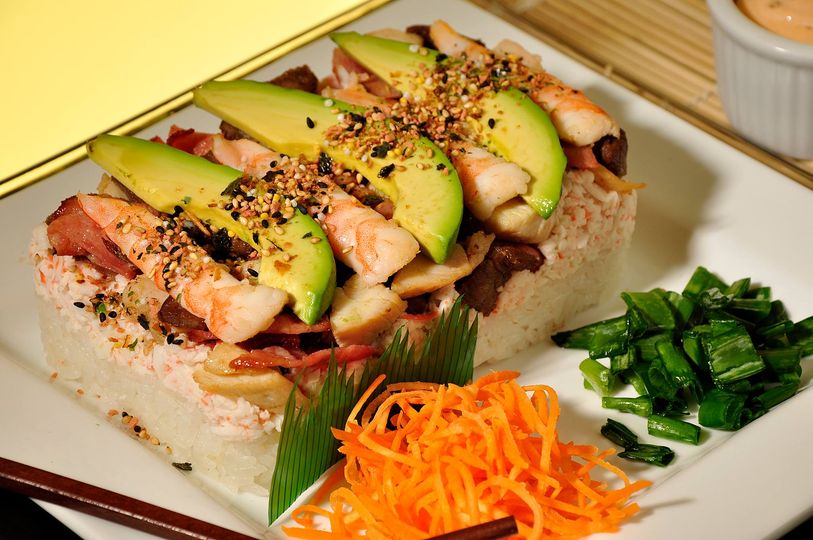 Camarón, pechuga de pollo, res y tocino sobe una cama de arroz blanzo, con pgiladelphia, tampico y aguacate arriba.