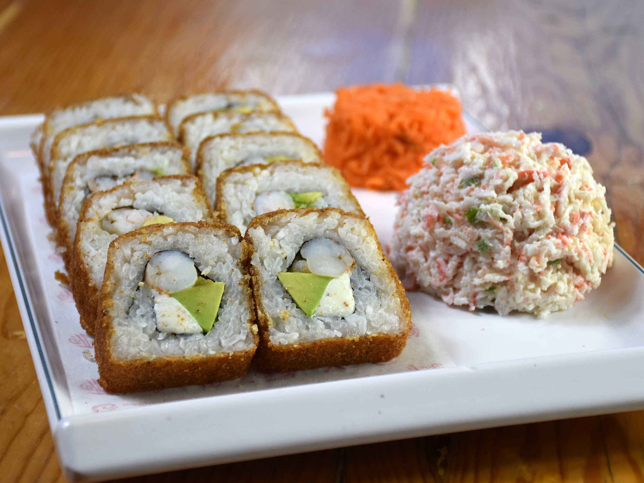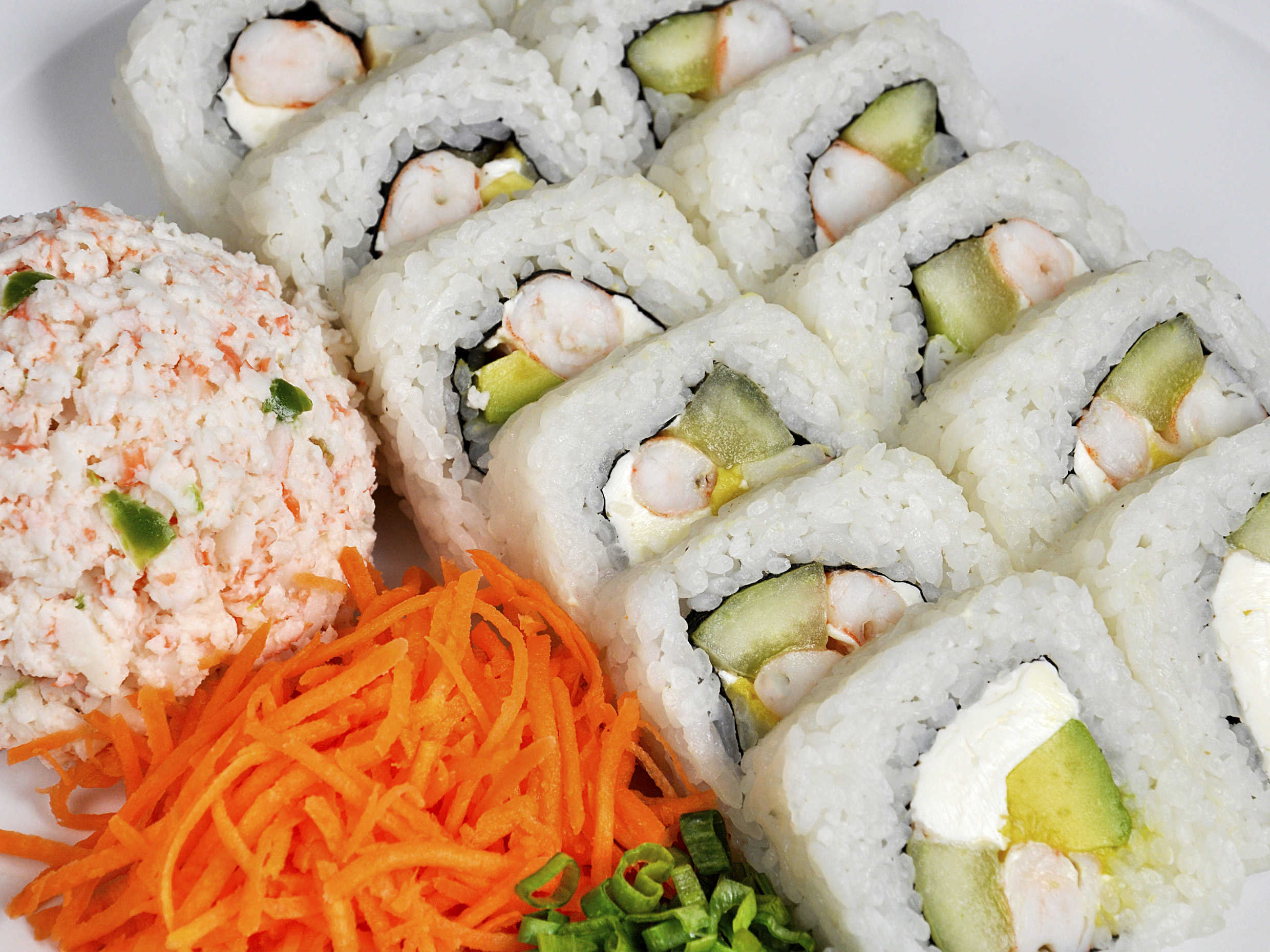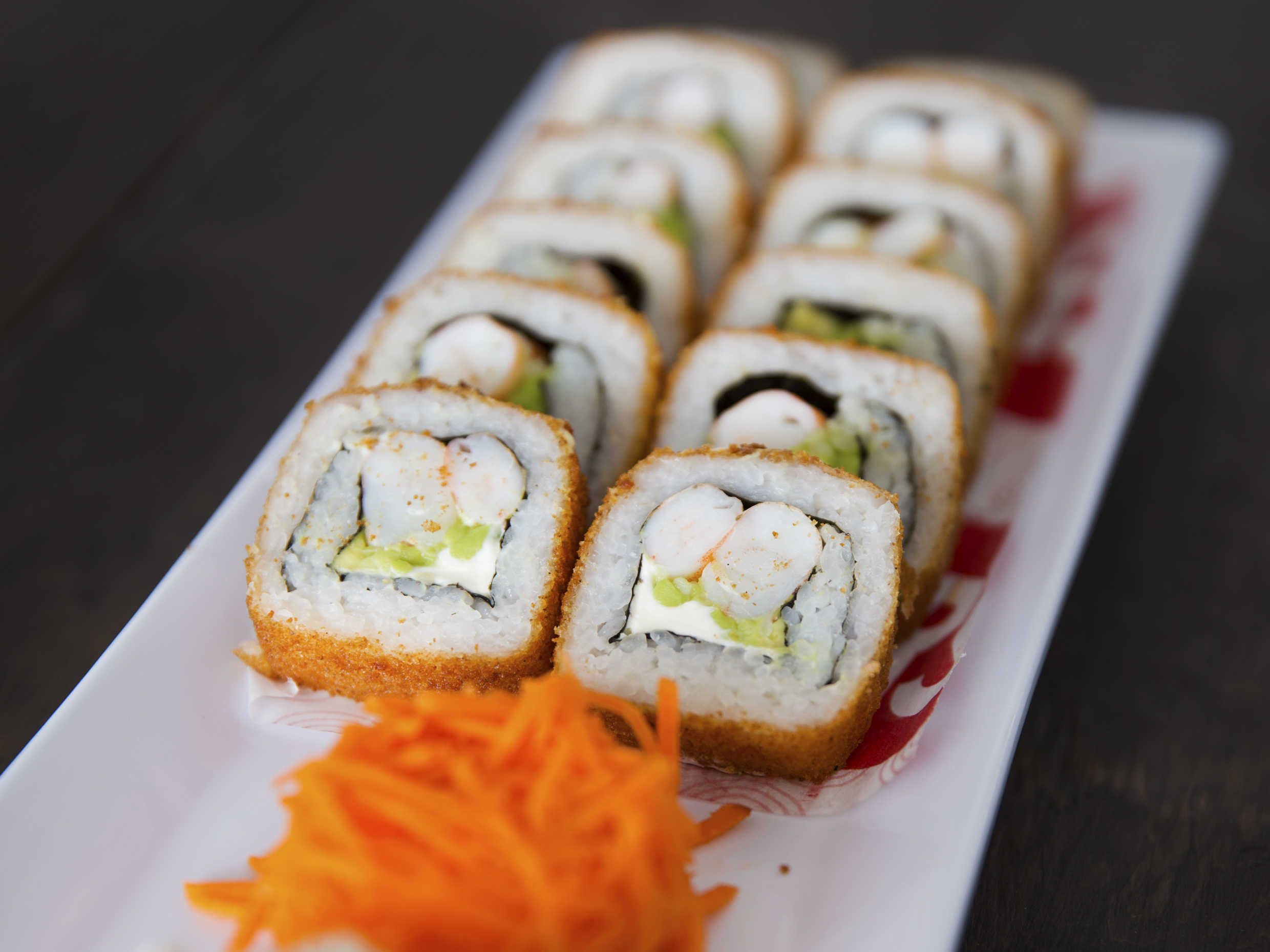 Camarón o salmón ahumado, philadelphia, aguacate y pepino por dentro. Incluye tampico.
