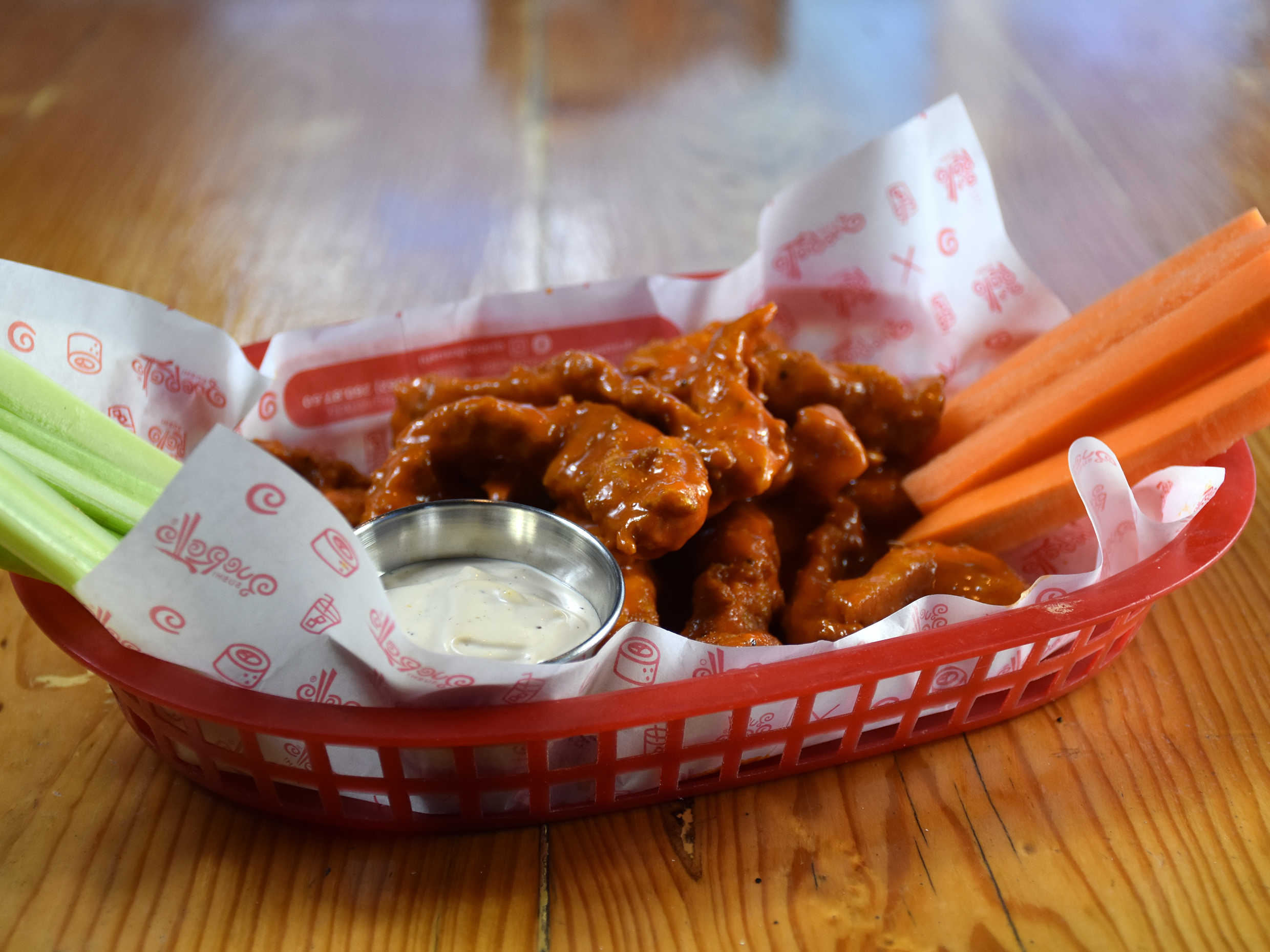 Trozos de pechuga de pollo de 250 gr., empanizados y con salsa a elegir Acompañados con apio, zanahoria y adrezo de la casa.