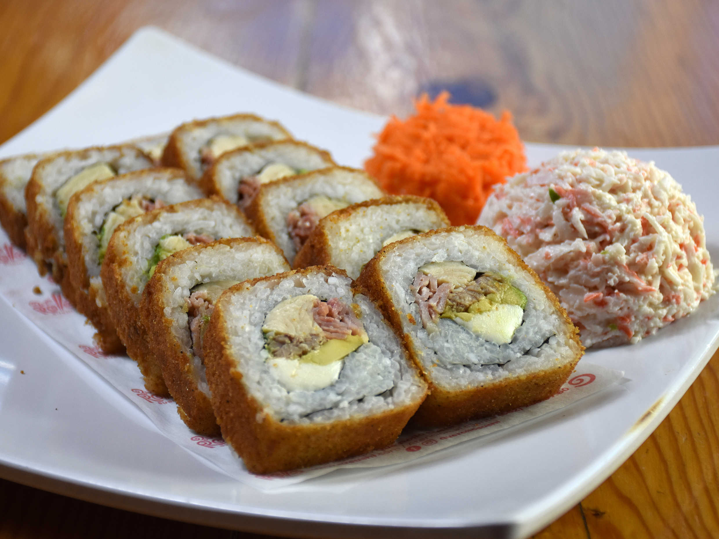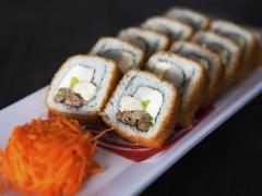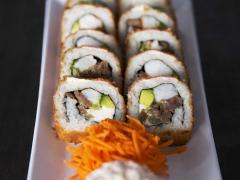 Pepino, philadelphia y aguacate por dentro, topping de camarón tempura, tampico, trozos de tocino, salseado con chipotle spicy, con una lluvia de togarashi.