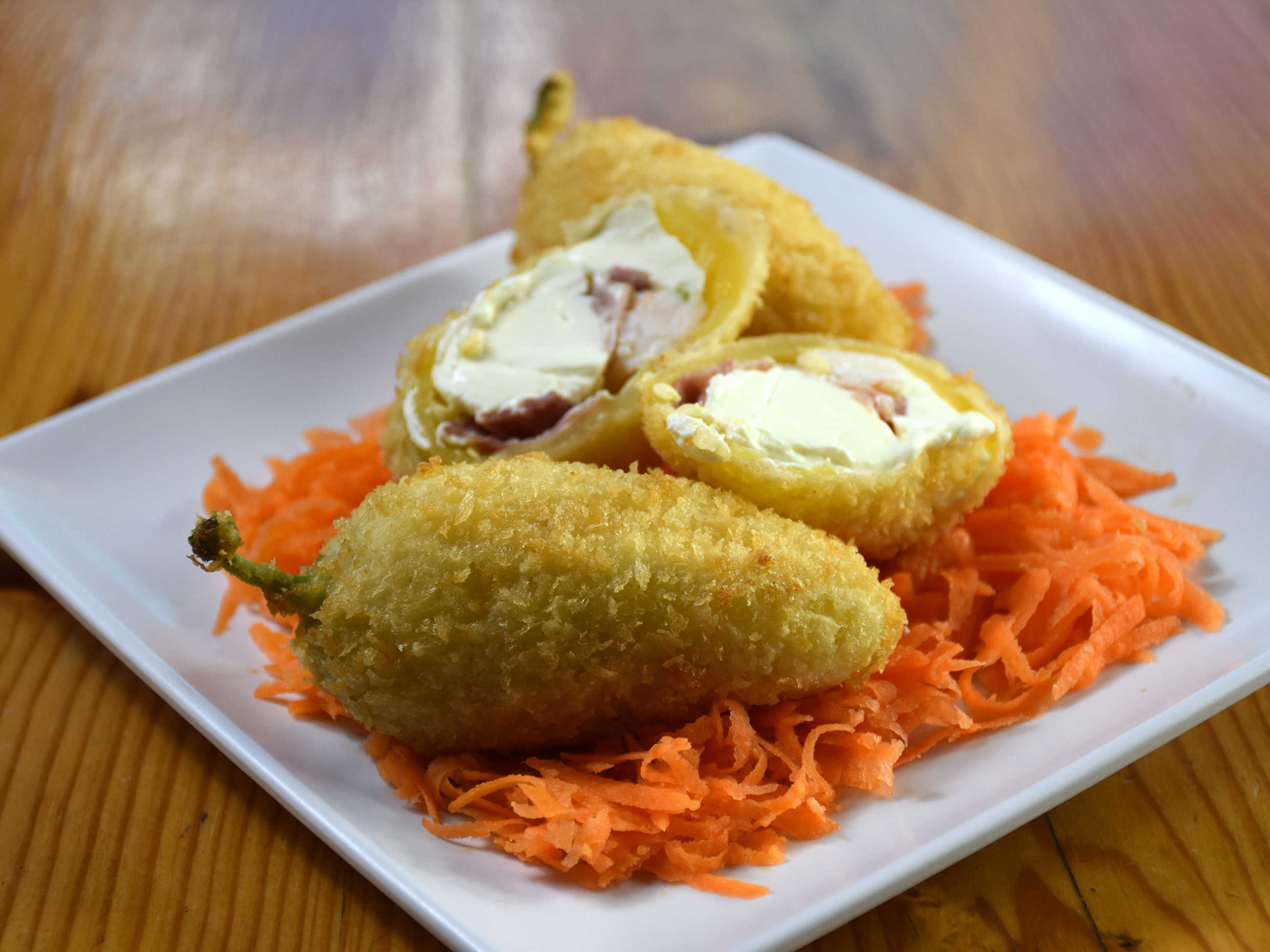 3 chiles caribe toreados, empanizados y rellenos de camarón, tocino y philadelphia.