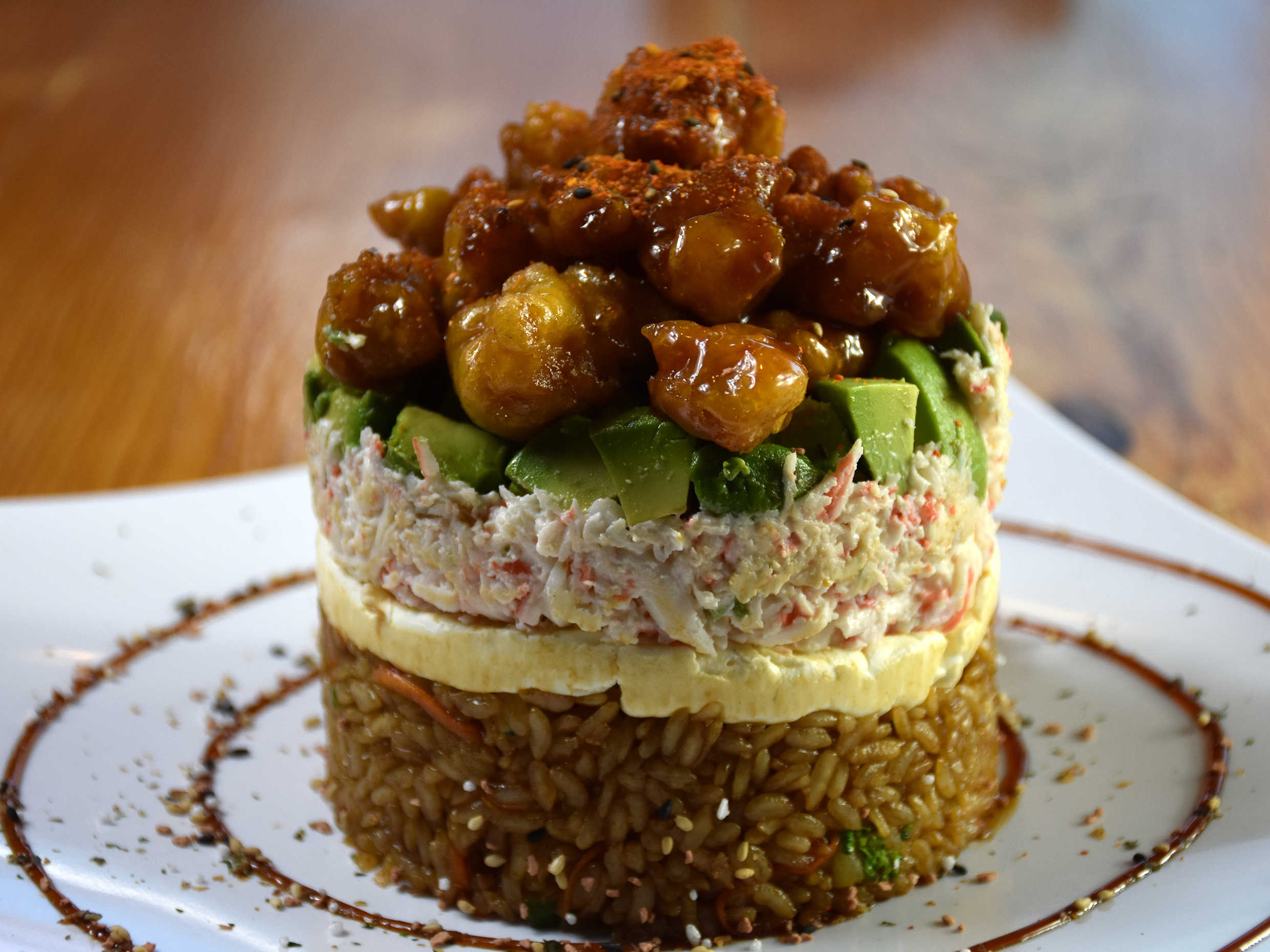 Torre de arroz yakimeshi, sazonado con salsa secreta, tampico, queso philadelphia, aguacate y pollo honey. Espolvoreado con togarashi.