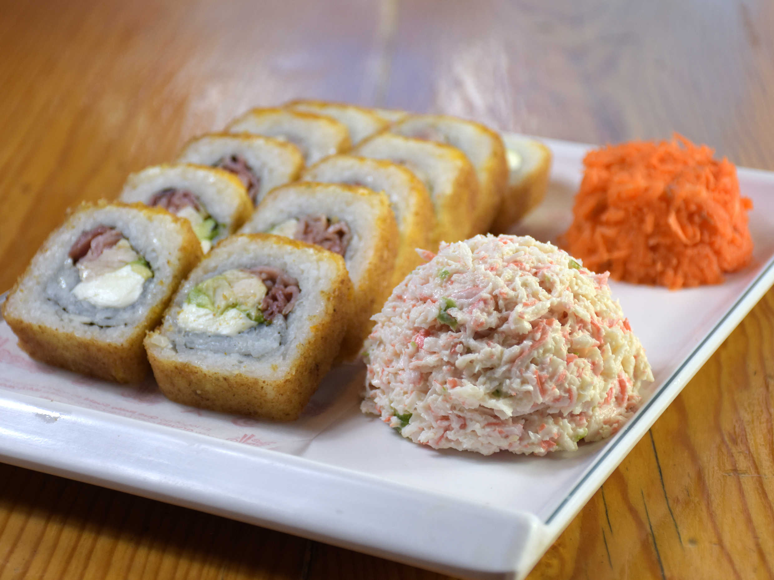 Camarón, res y chile toreado por dentro, cangrego y philadelphia por fuera. Incluye tampico.