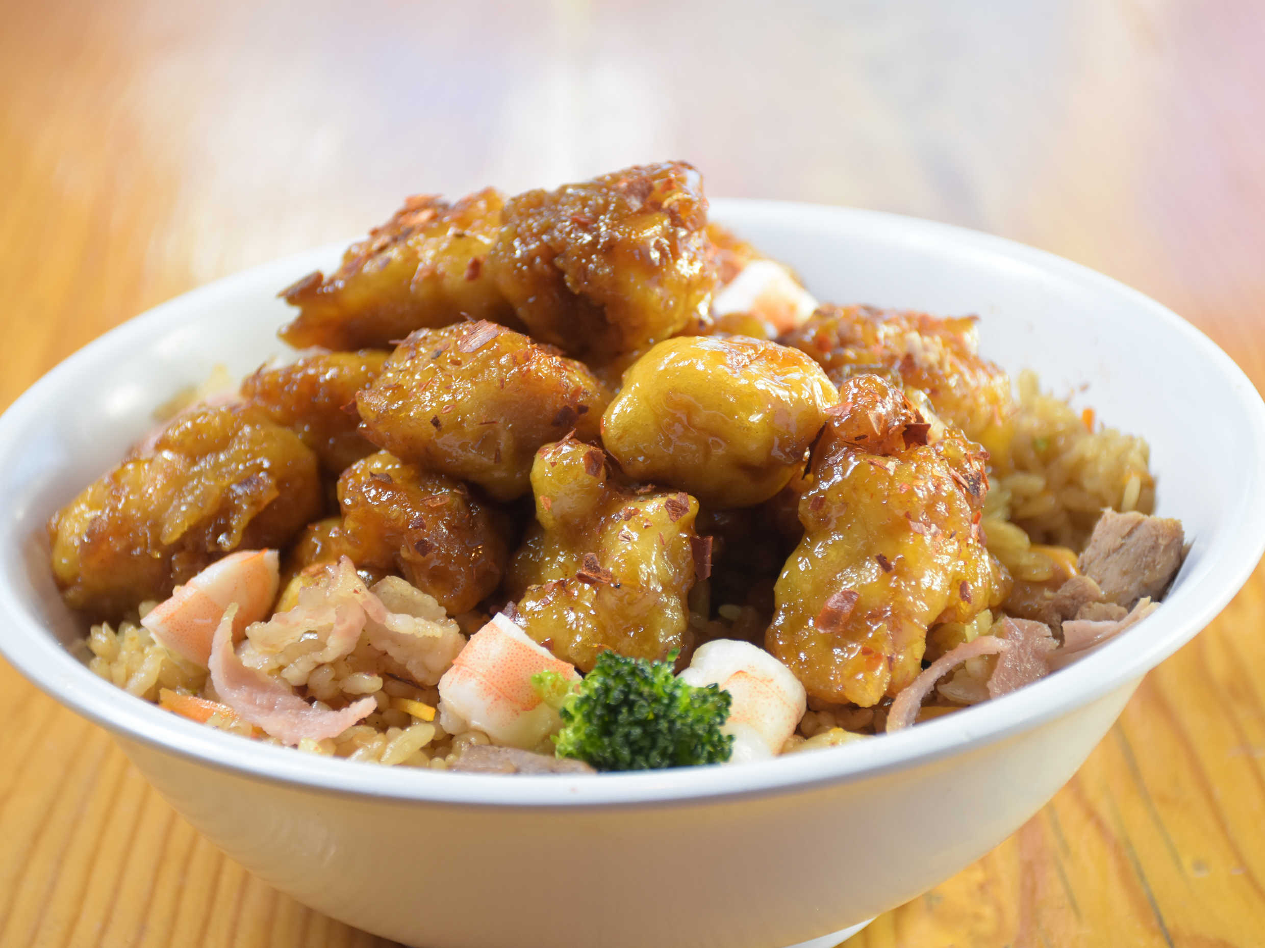 Base de arroz yakimeshi, acompañado con pollo, res, camarón y tocino al sartén. Sazonado con nuestra salsa secreta y pollo honey.