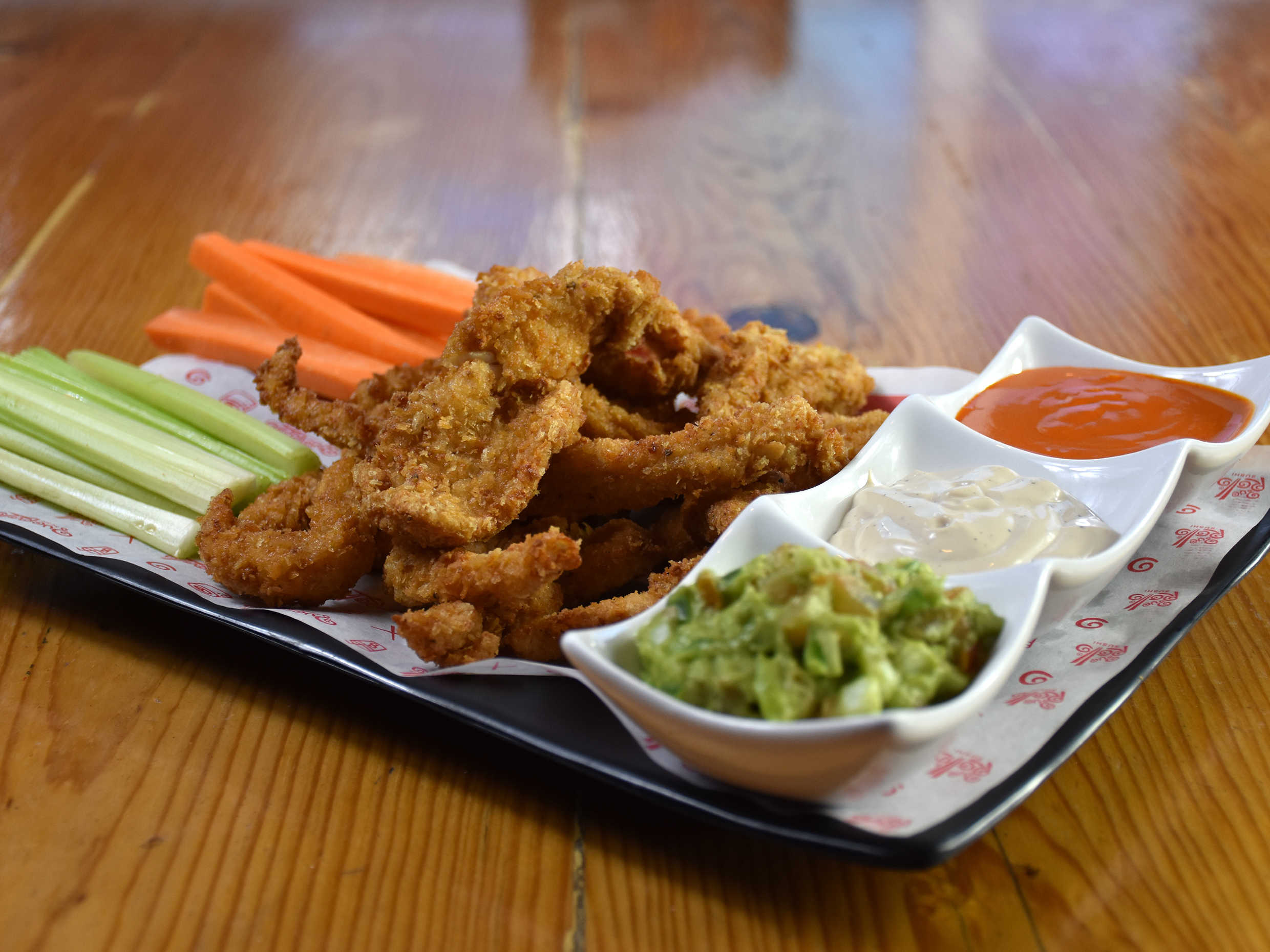 Trozos de pechuga de pollo de 250 gr., empanizados en panko y con salsa a elegir, acompañados con guacamole, apio, zanahoria y adrezo de la casa.