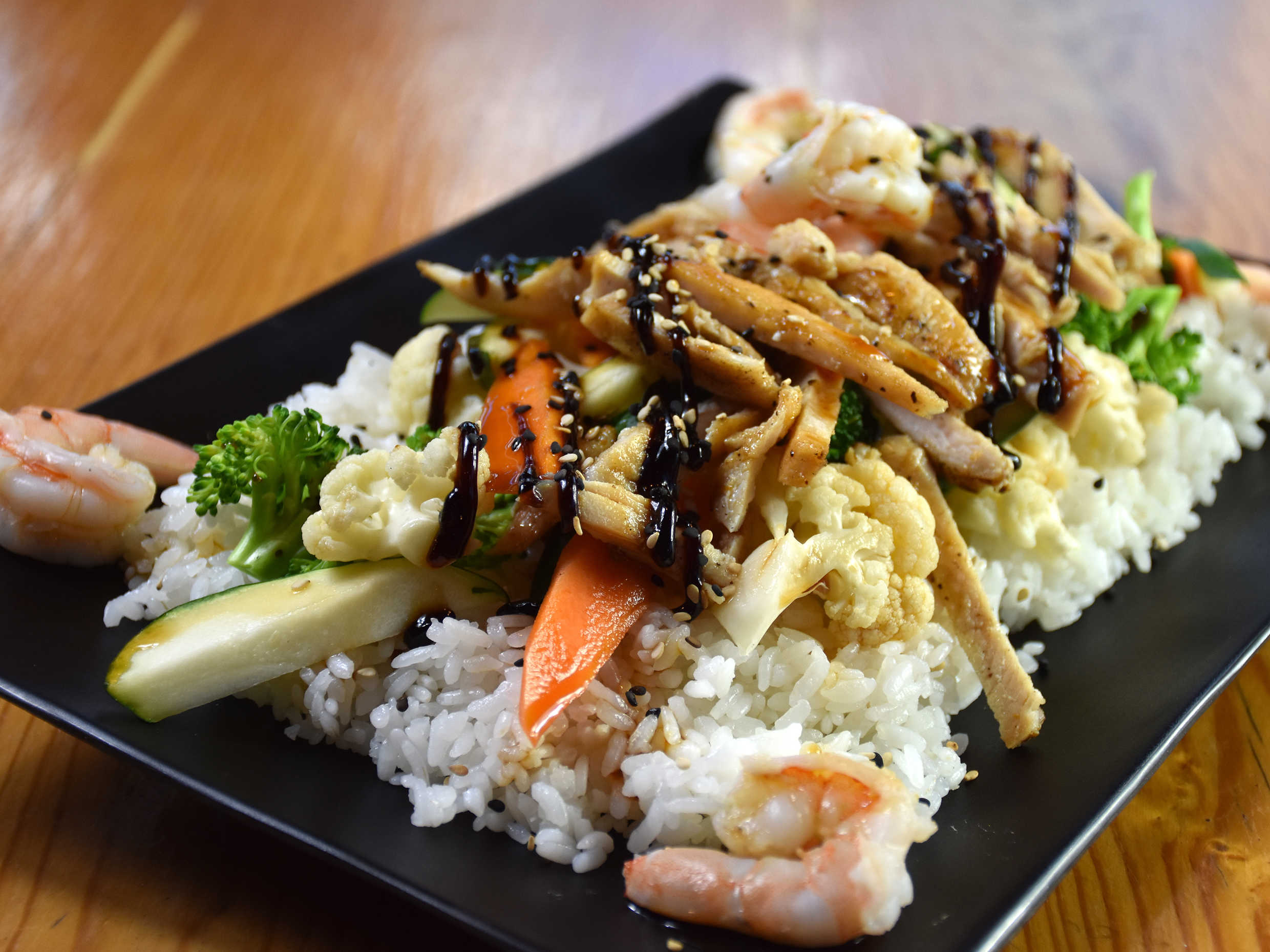 Combinación de verduras cocidas al vapor, sobre una cama de arroz blanco, con tiras de pollo a la plancha y camarón cocido, bañado en salsa teriyaki, con un toque de ajonjolí.