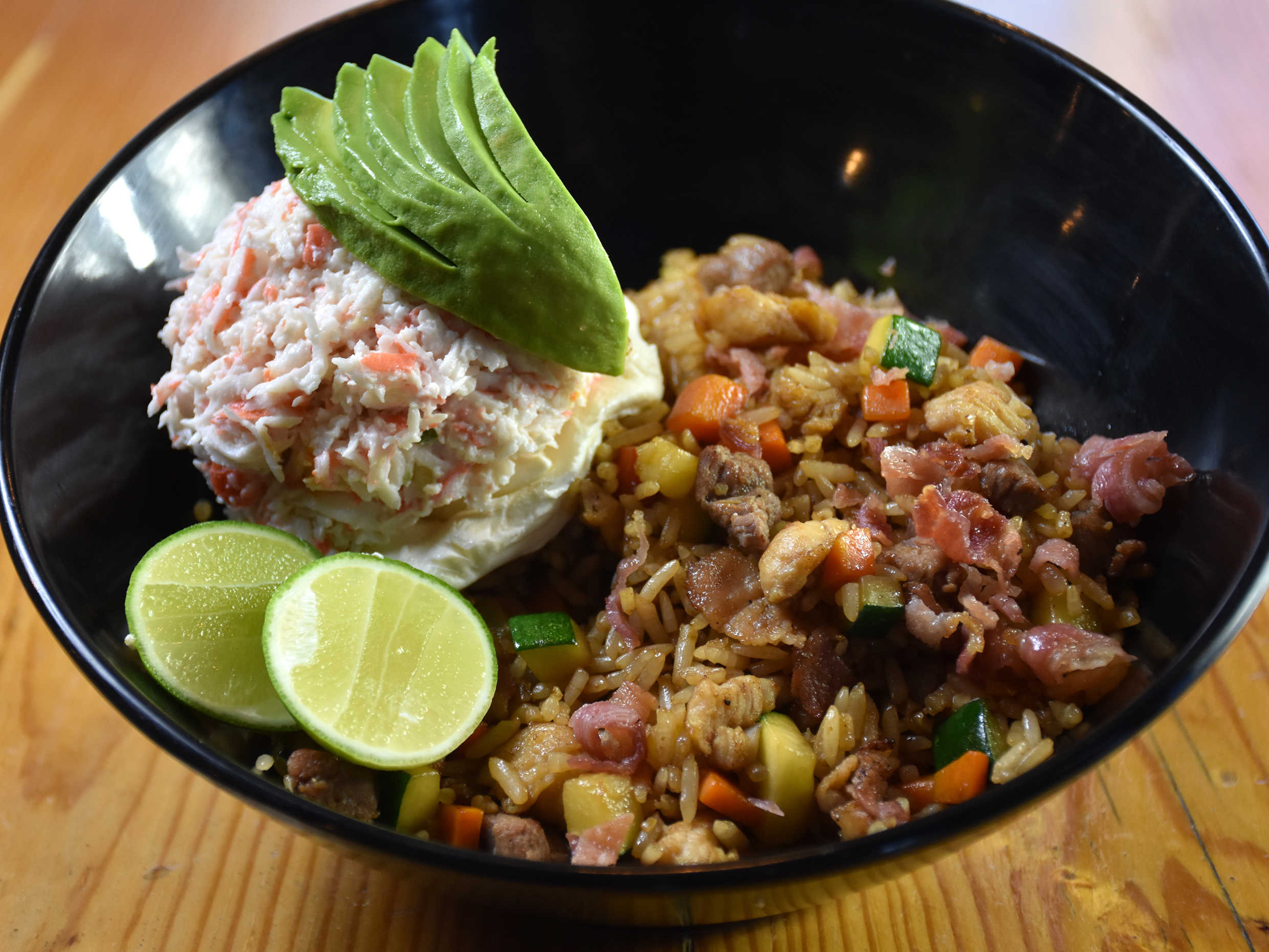 Arroz frito con res, pollo, tocino y verduras. Philadelphia, tampico y aguacate arriba.