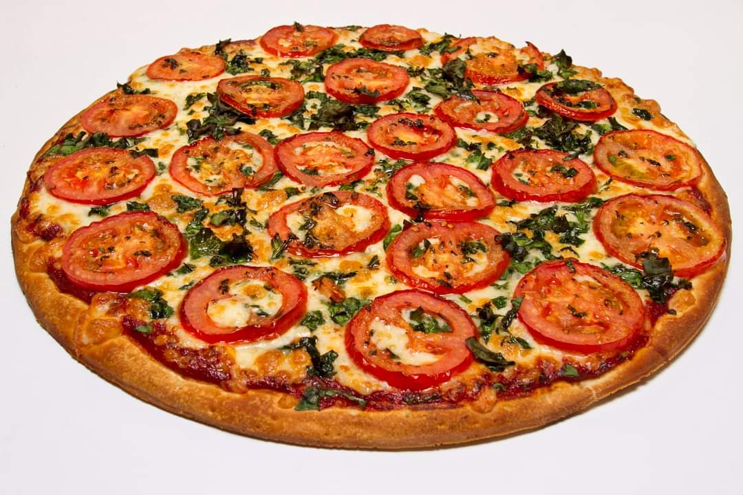 Tamaño 14 pulgadas, espinacas, queso doble, tomate en rebanadas.