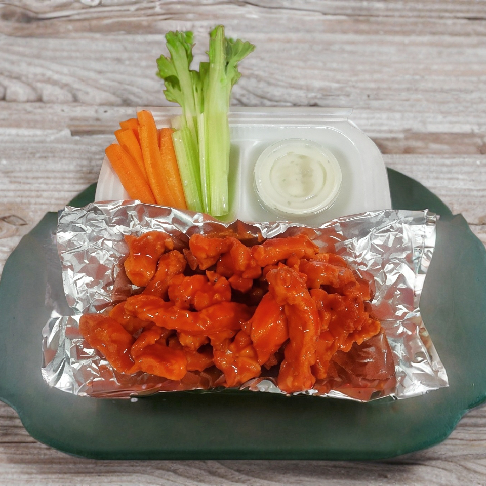 300 gramos de pechuga de pollo bañada en salsa búfalo acompañados de apio, zanahoria y aderezo ranch.